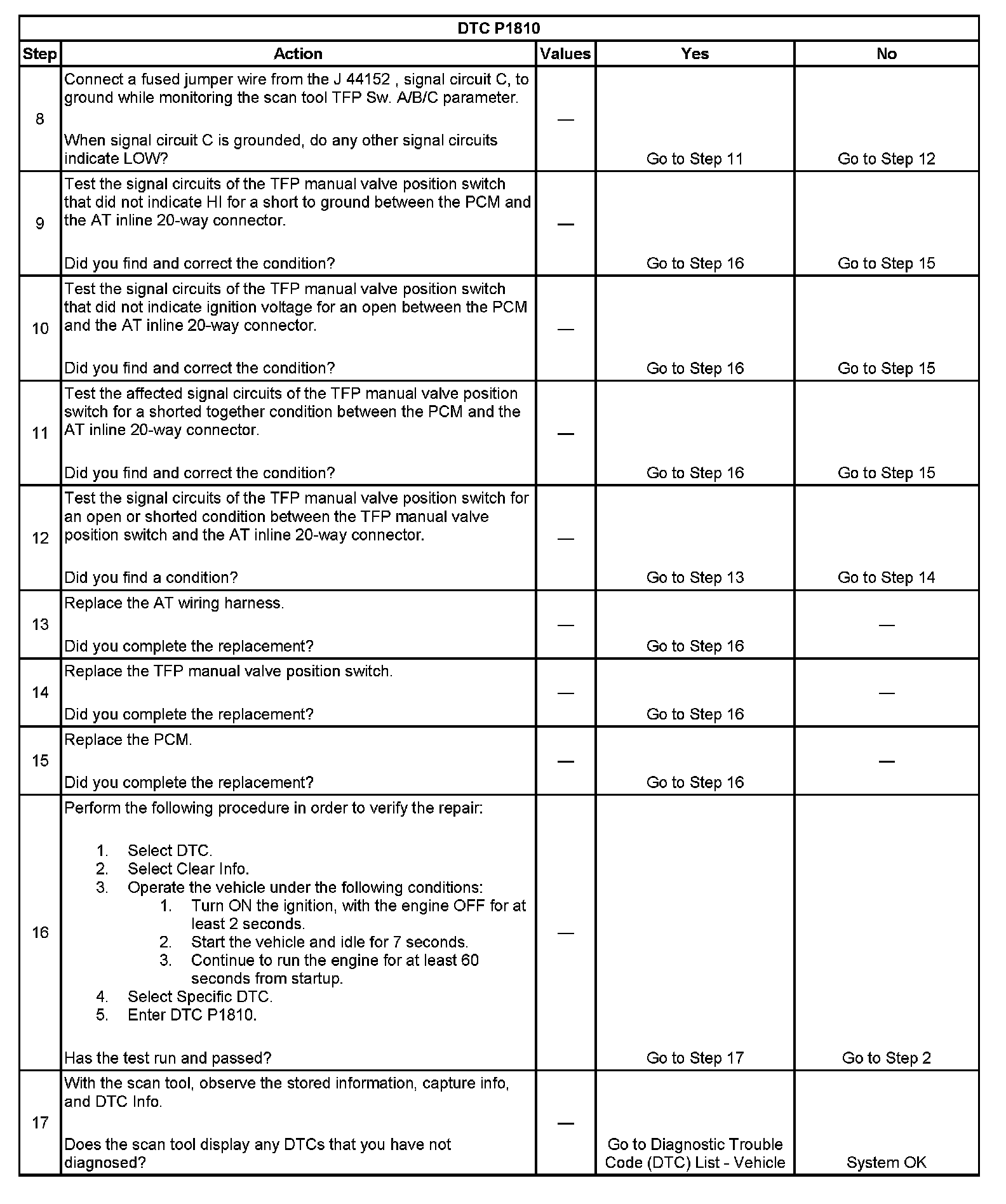 When the PCM detects an invalid state of the TFP manual valve position switch circuit by deciphering the TFP manual valve position switch inputs, then DTC P1810 sets. DTC P1810 is a type B DTC.