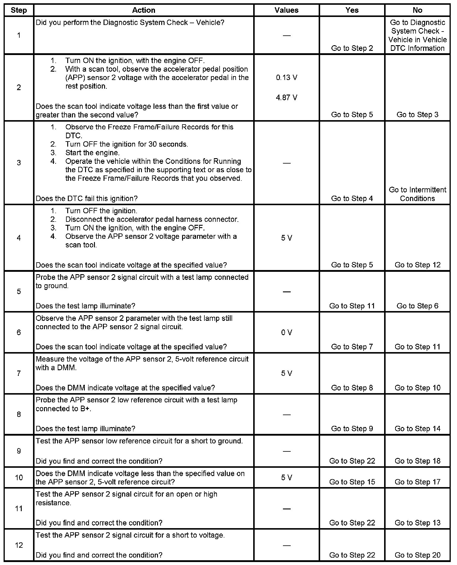 The APP sensor 2 voltage is less than 0.13 volt or more than 4.87 volts for more than 0.5 second.