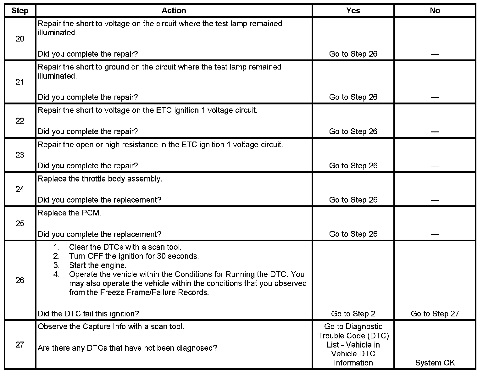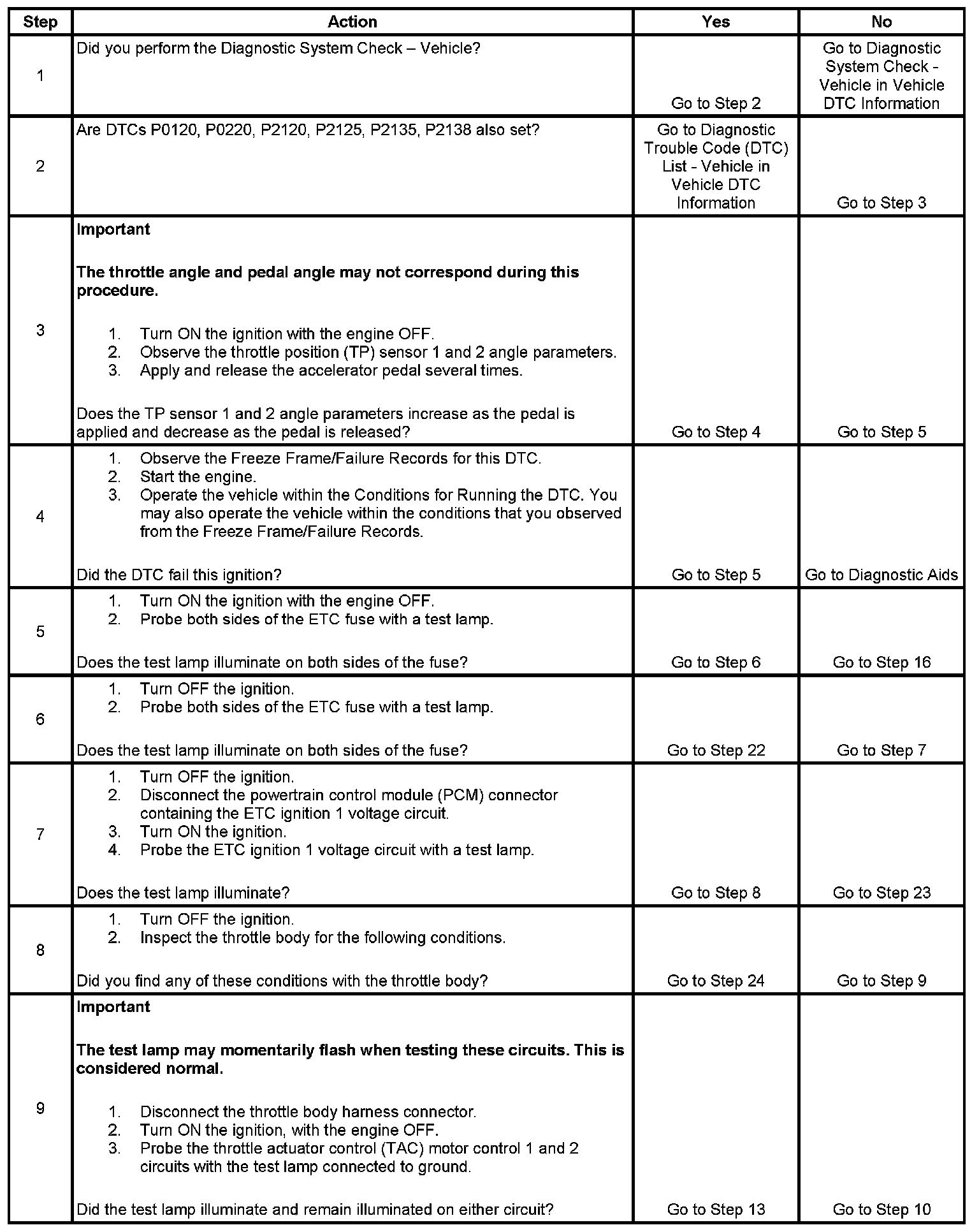 The numbers below refer to the step numbers on the diagnostic table.