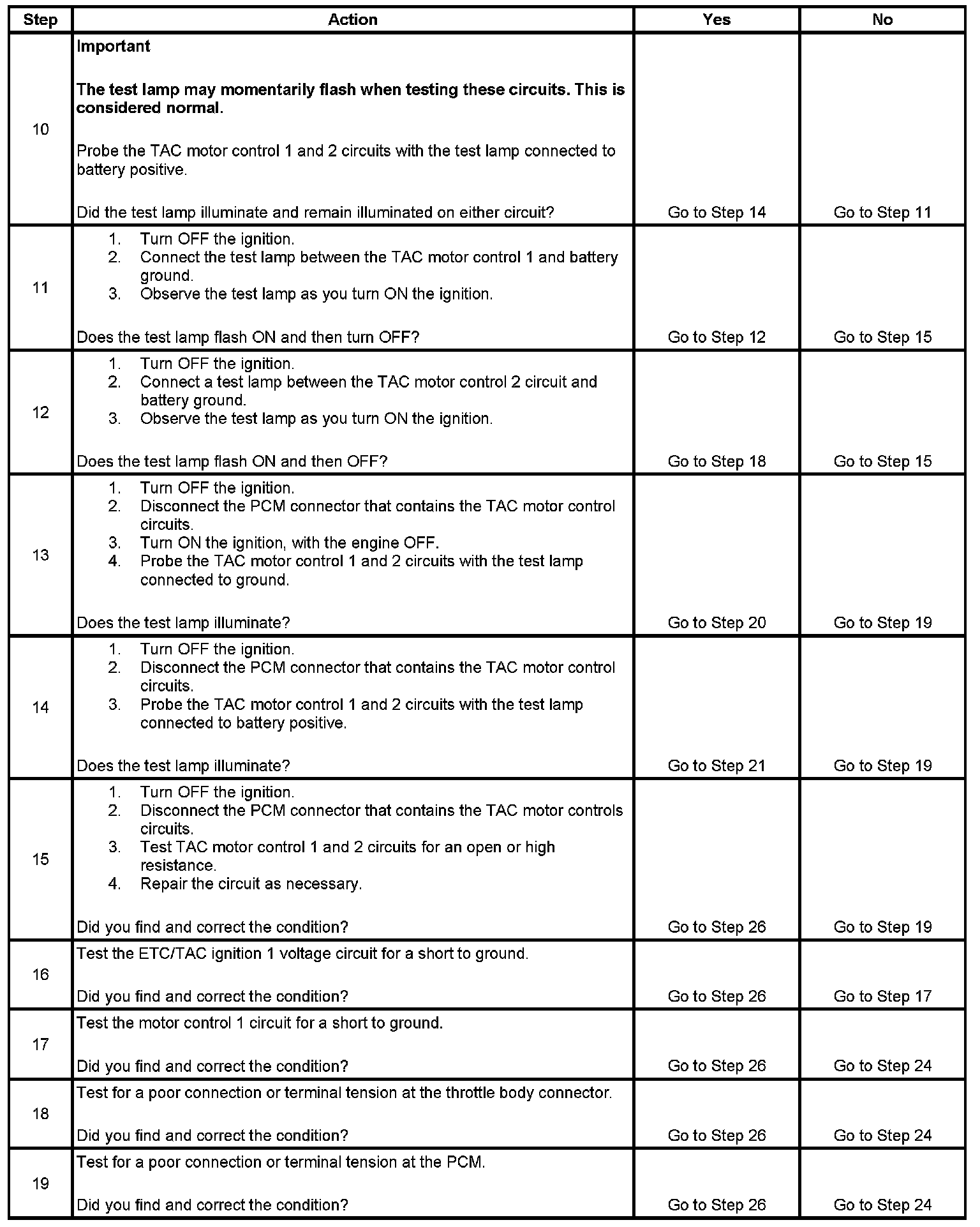 11. When the ignition is turned ON, the PCM operates the throttle control motor to verify the integrity of the system prior to start-up. This can be seen by the momentary flash of the test lamp as the ignition is turned ON.
