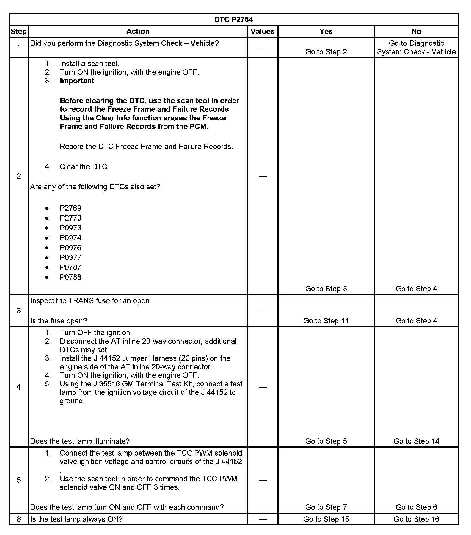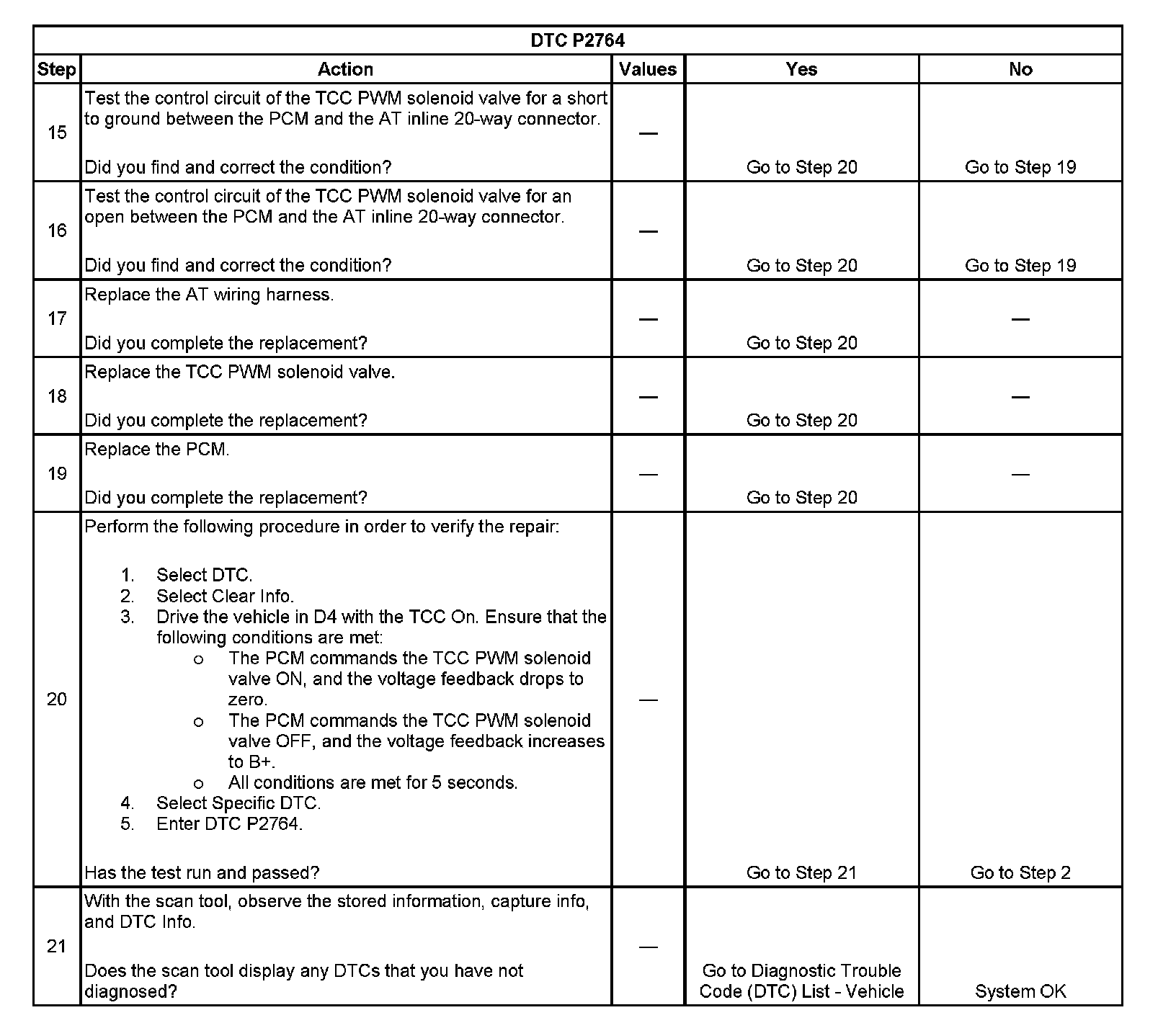 When the PCM detects a continuous open or short to ground in the TCC PWM solenoid valve circuit, then DTC P2764 sets. DTC P2764 is a type B DTC.