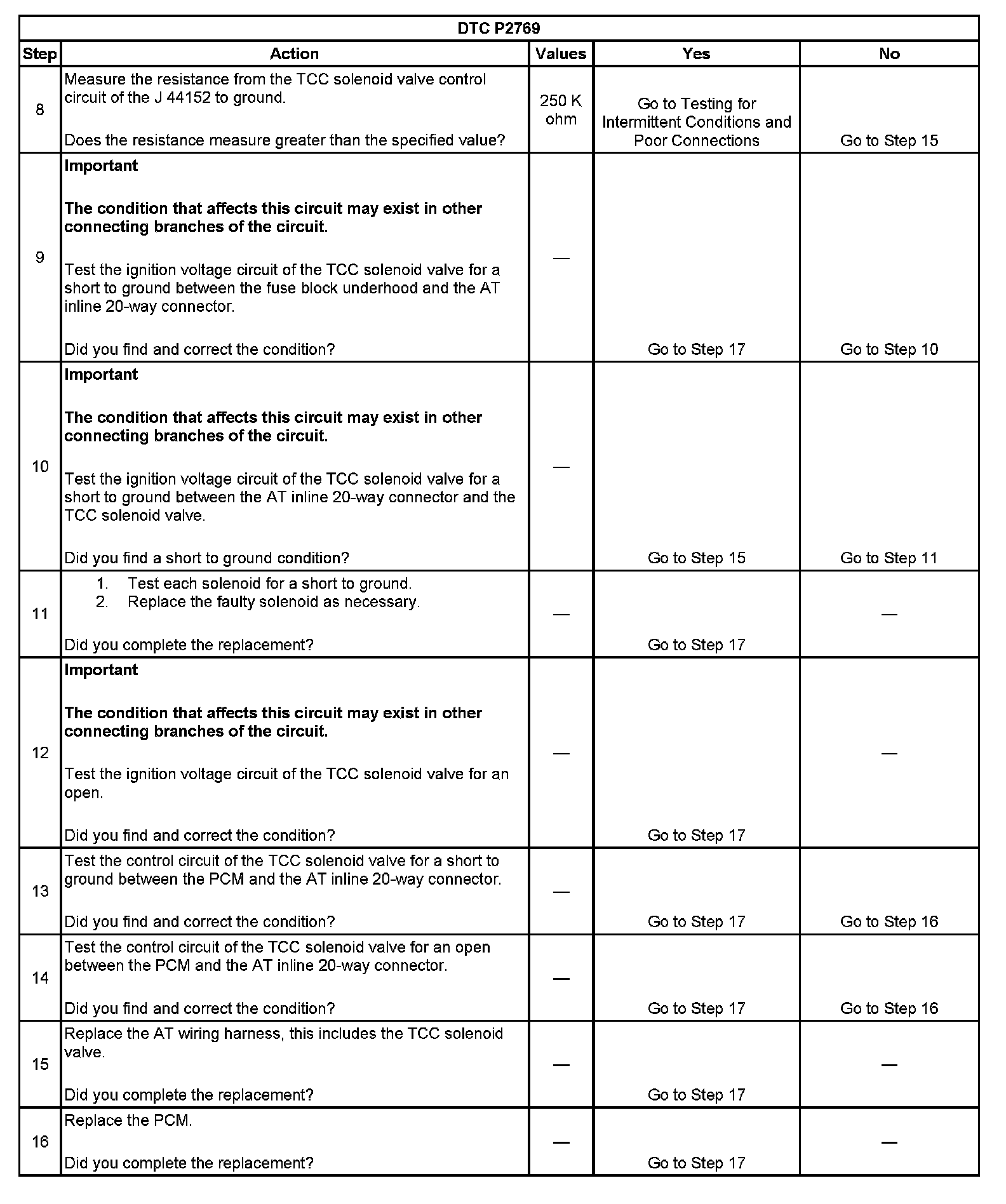 7. This step tests the resistance of the TCC solenoid valve and the automatic transmission (AT) wiring harness.