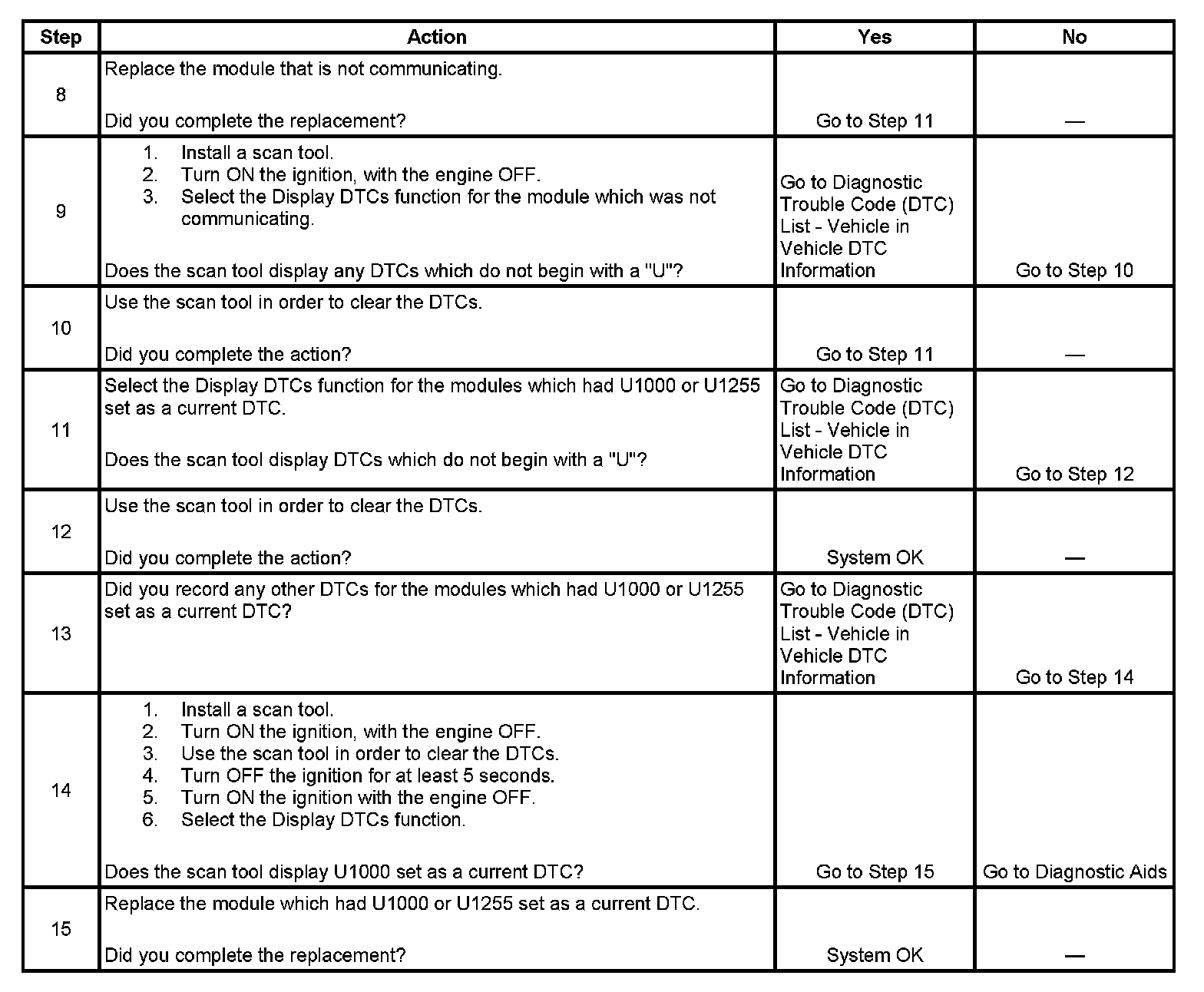 10. The modules which can communicate indicate the module which cannot communicate. You must clear the serial data communication DTCs from these modules to avoid future misdiagnosis.