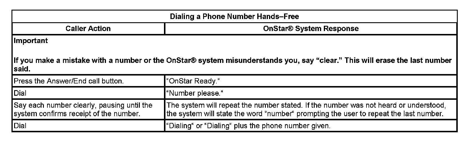 During a hands-free call, the microphone and audio system operate the same way as a standard OnStar(R) call. When the Answer/End Call button is pressed, the audio system will mute; the OnStar(R) system will then return the prompt "OnStar Ready". At this point there are specific commands set to initiate a cellular call. If the vehicle receives a call when the radio is ON, the audio system will mute and an audible ring will be heard though the speakers. The call will be answered when the answer/end call button is pressed.