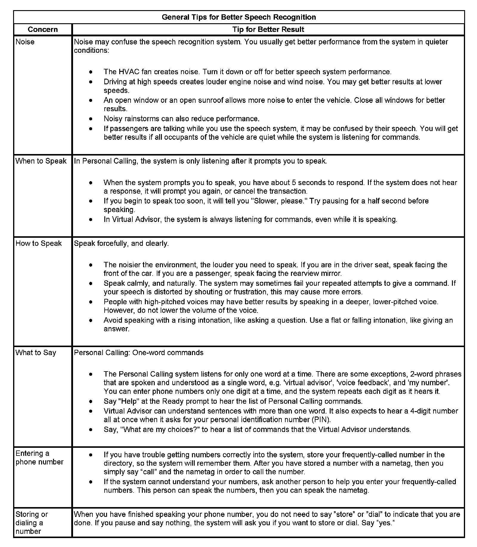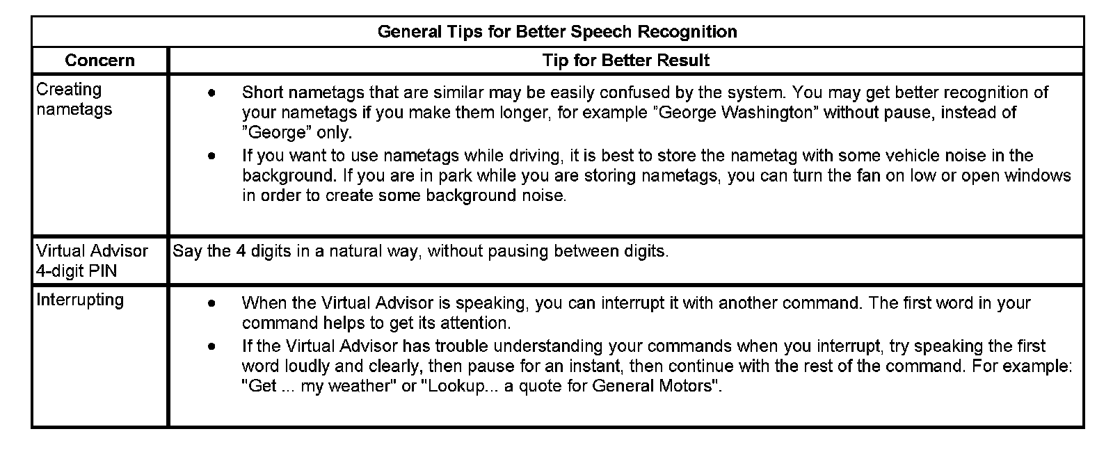 The OnStar(R) speech recognition systems use speech technology that is designed to understand a wide range of American English speakers. Although there is no one right way to speak English, the system will work best when users try to modify their pronunciation should they encounter difficulty. Users who do not obtain good results are advised to try the tips and workarounds.