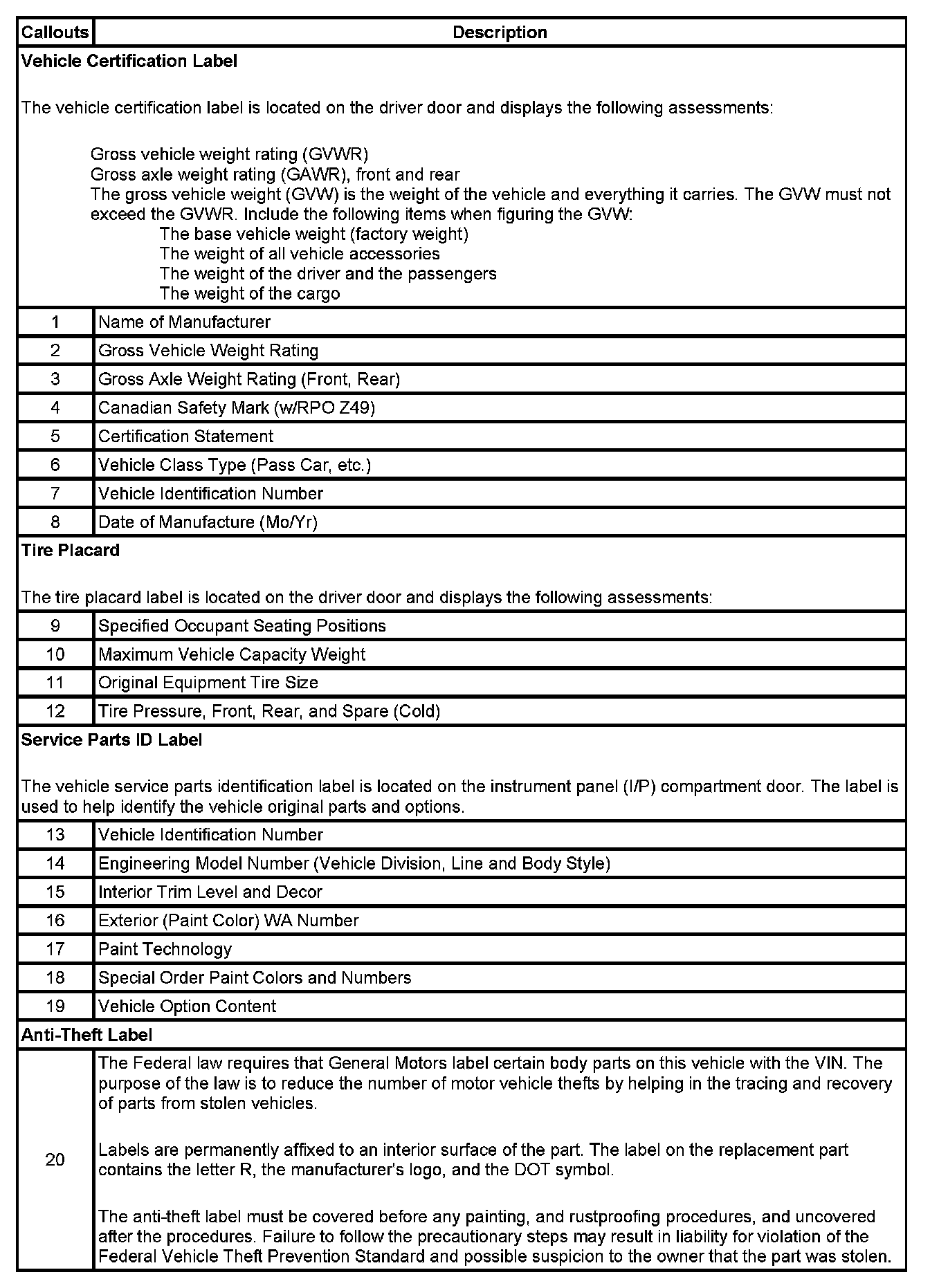 Label - Vehicle Certification, Tire Place Card, Anti-Theft and Service Parts ID