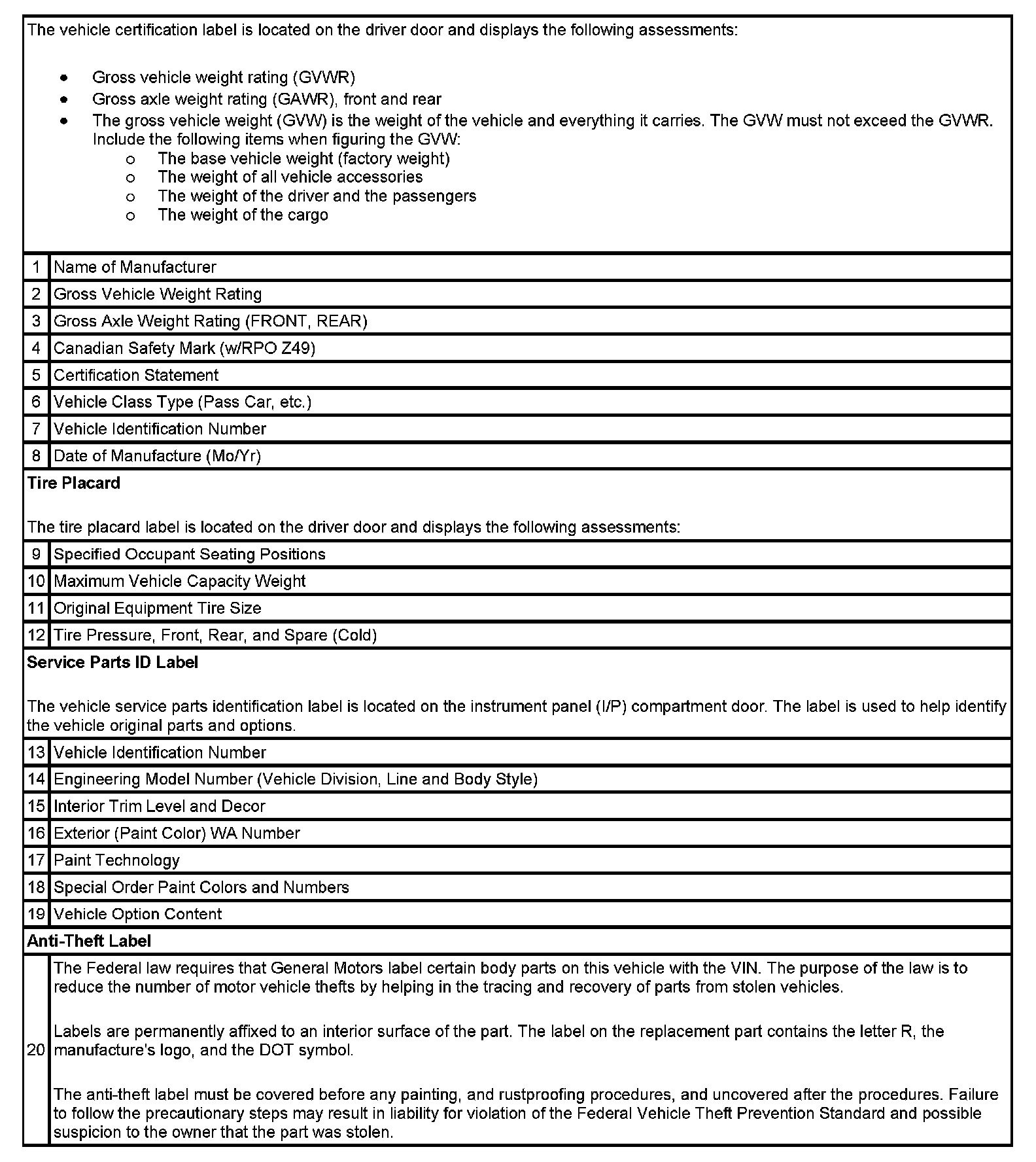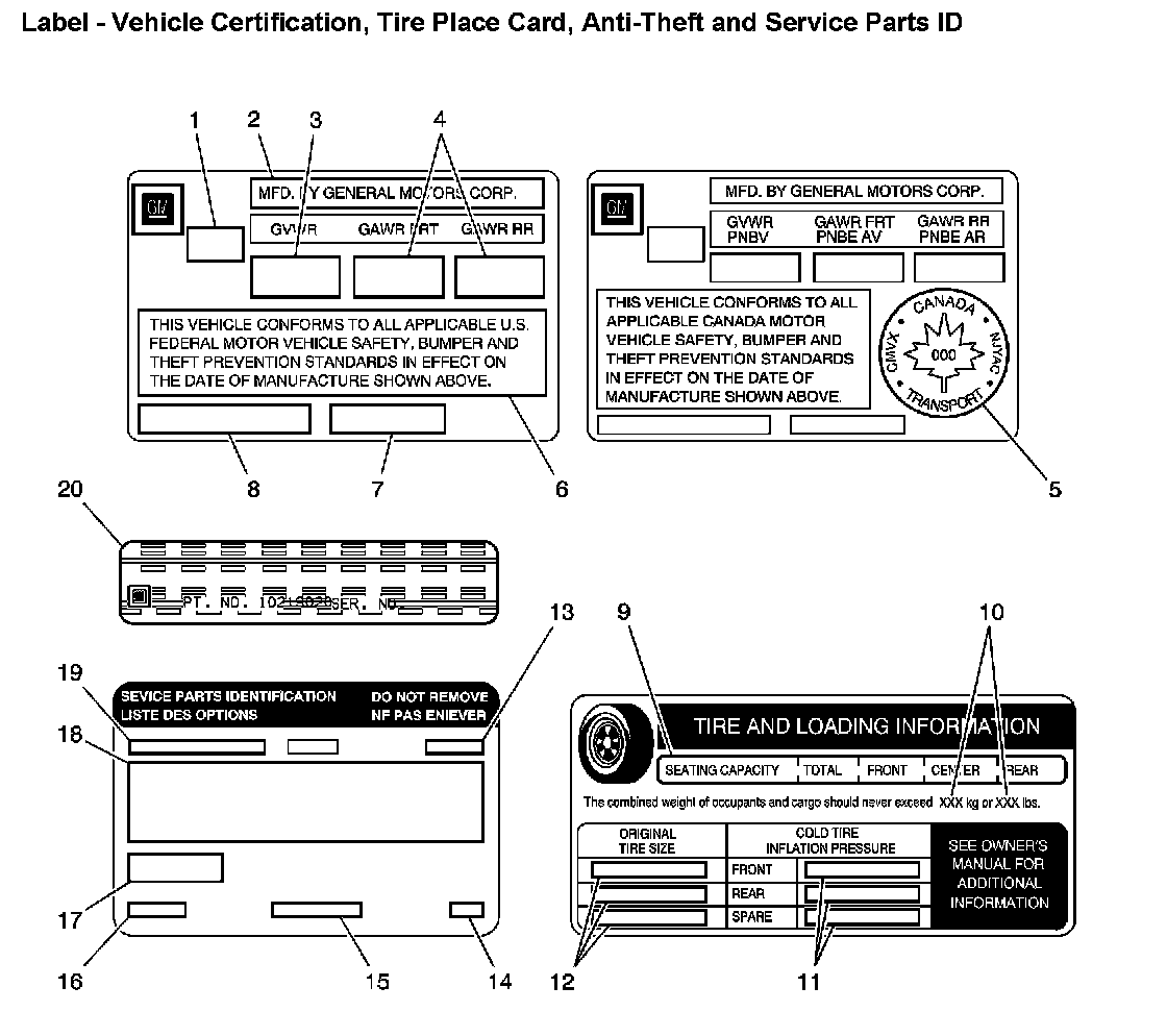 Label - Vehicle Certification, Tire Place Card, Anti-Theft And Service Parts ID: