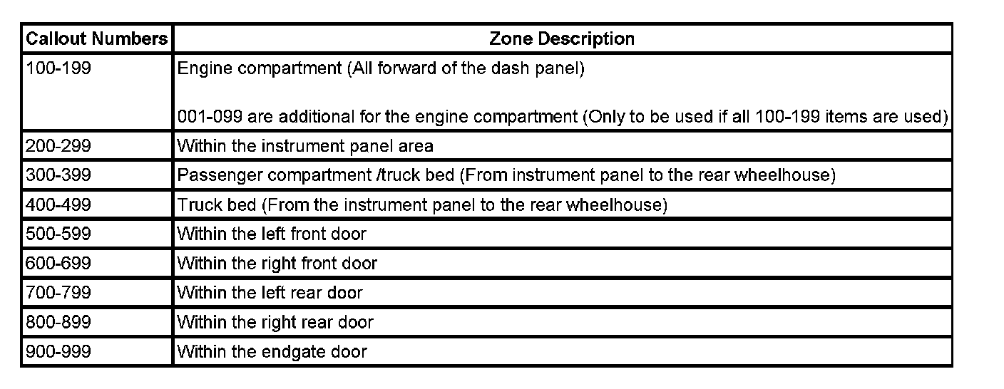 All grounds, in-line connectors, pass-through grommets, and splices have identifying numbers that corresponds to where they are located in the vehicle. The following table explains the numbering system.
