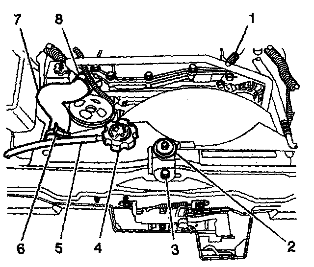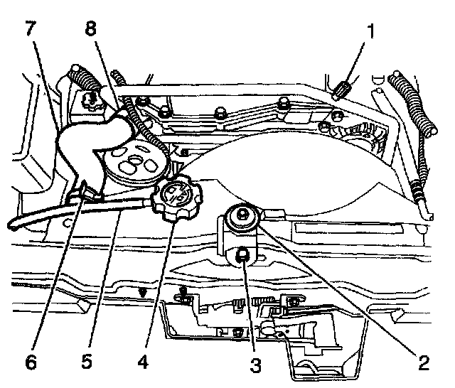 2. Position the J 38185 to the clamp (8) in larder to remove the radiator outlet hose (7) from the water outlet housing.
