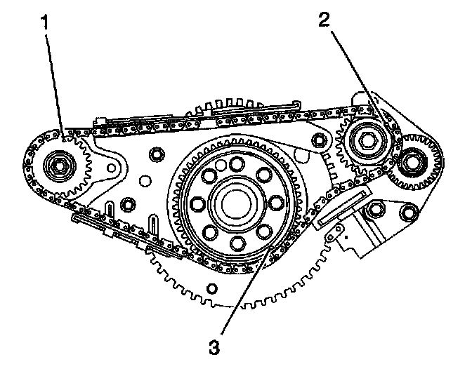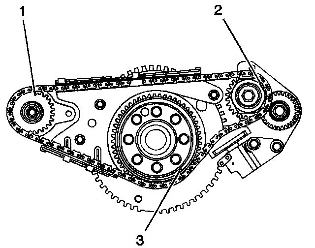 ^ The 3 timing marks (1-3) on the sprockets line up with a dark link on the chain