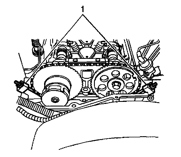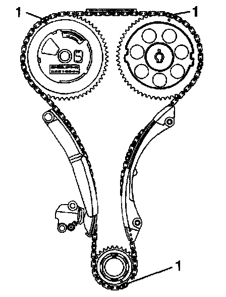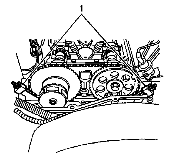 1. Install the intake camshaft sprocket into the timing chain. Aligning the marked link (1) on the timing chain with the timing mark on the intake camshaft sprocket.