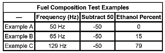 3. Subtract 50 from the reading on the DMM in order to obtain the percentage of alcohol in the fuel sample. Refer to the examples in the Fuel Composition Test Examples table.