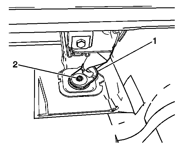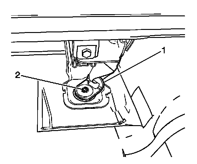 2. Remove the grommet securing the center seat belt buckle assembly (1) to the seat adjuster.