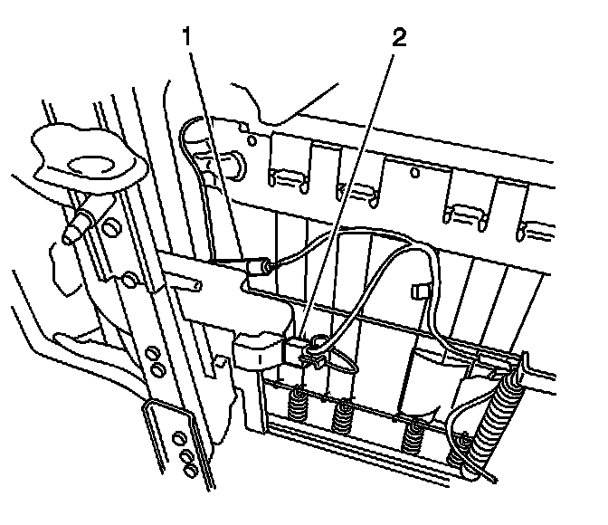 4. Pull the seat belt buckle assembly (1) out though the opening in the seat cushion.