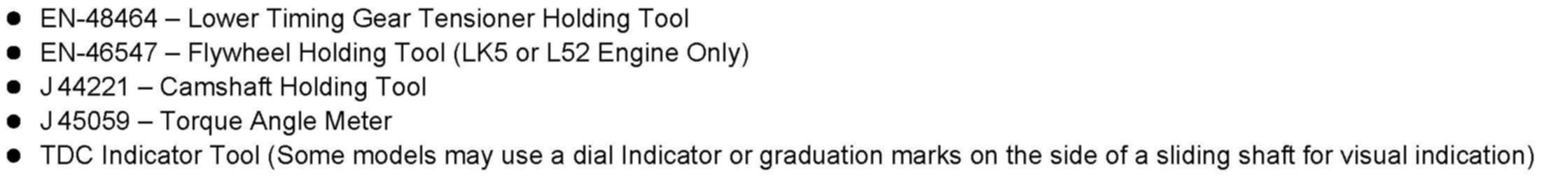The following new service information outlined in this bulletin will aid technicians in removal and installation of the cylinder head without the removal of the front engine cover. The new service procedure can be done in-vehicle with the aid of a new General Motors special service tool part number EN-48464 Lower Timing Gear Tensioner Holding Tool.