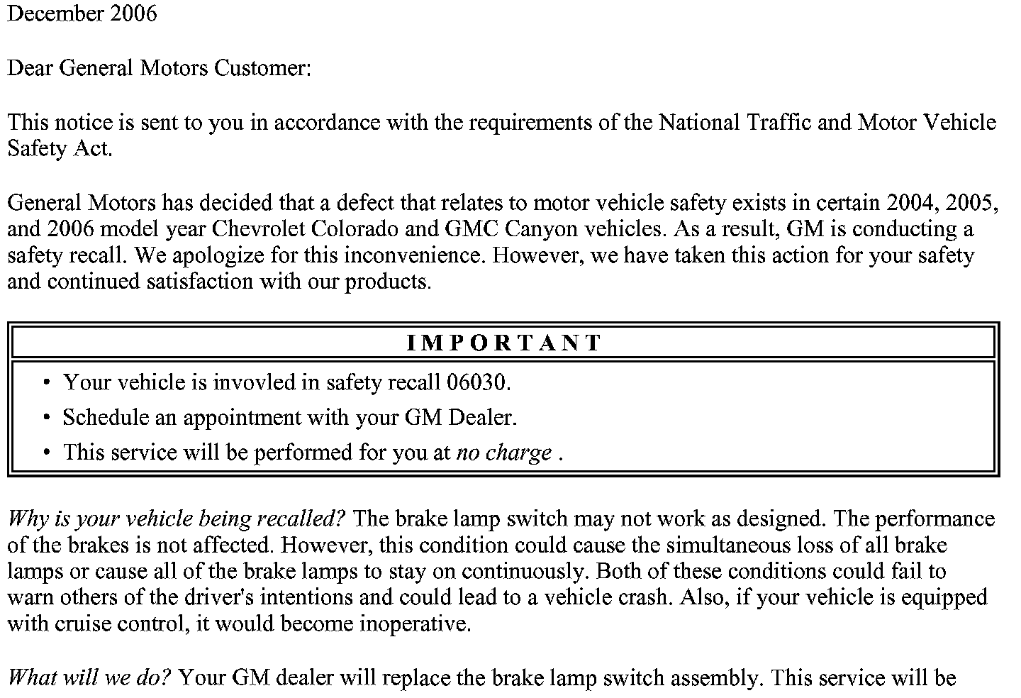 Recall - Brake Lamp Switch Replacement