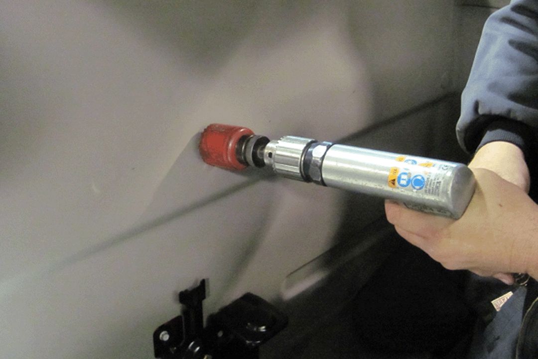 To avoid damaging the sheet metal behind the trim panel, the drill bit must NOT extend more than 12 mm (3/16 in) from the outside edge of the hole saw.