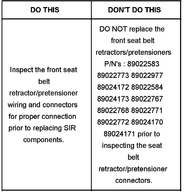 The most likely cause of the DTC(s) is a poor and/or intermittent connection at the front seat belt retractor/pretensioner. It has been found at the Warranty Parts Center (WPC) that front seat belt retractors/pretensioners are unnecessarily being replaced for the above listed DTCs.