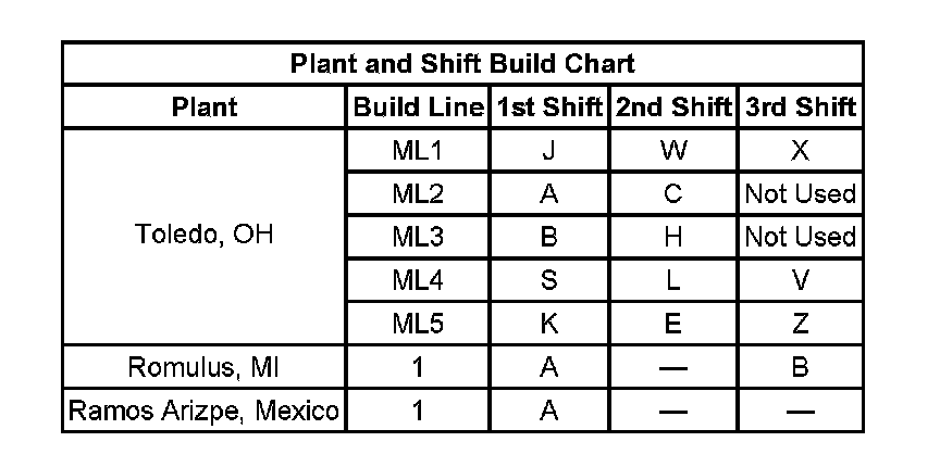 12 - Build Location Y = Toledo, OH, R = Romulus, MI, 4 = Ramos Arizpe, Mexico