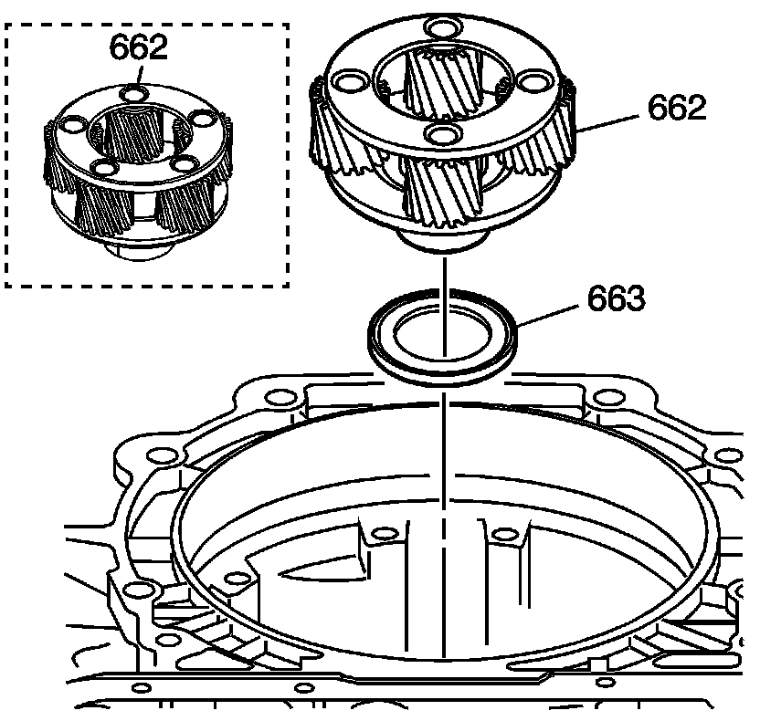 2. Remove the input carrier assembly (662) and remove the thrust bearing assembly (663).