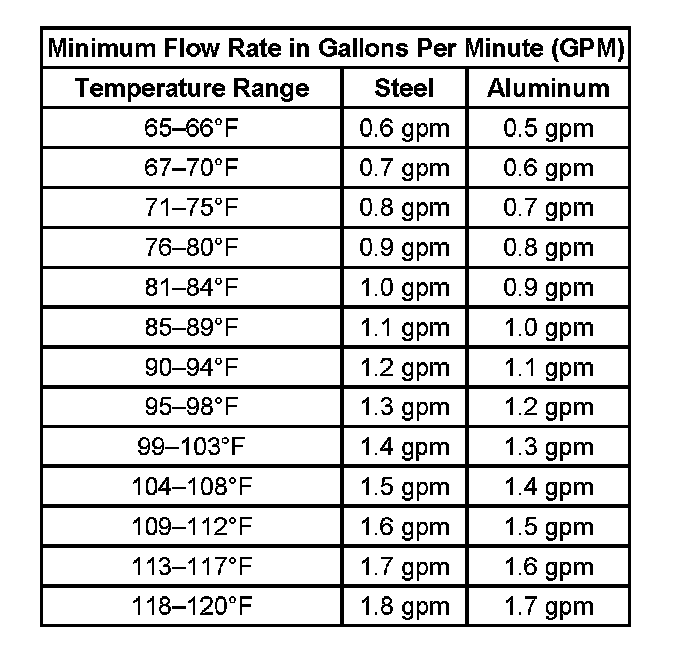 3. Refer to the table. Using the temperature from step 1, locate on either the Steel MINIMUM Flow Rate table or the Aluminum MINIMUM Flow Rate table the minimum flow rate in gallons per minutes (GPM). Record the minimum flow rate in GPMs and the supply fluid temperature for further reference.