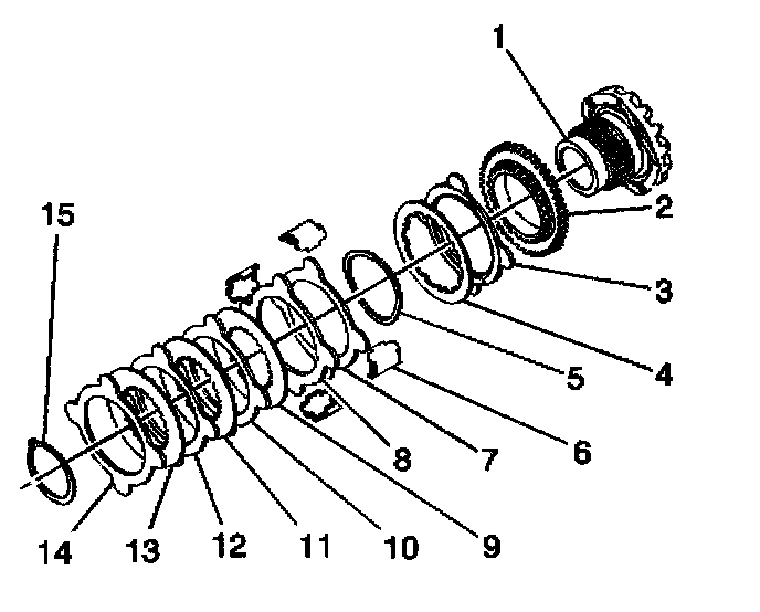 2.13. Install the retaining ring (15). Compress the clutch disc pack and align the teeth on the 3rd splined disc with the teeth on the cam plate in order to seat the retaining ring in the groove on the cam side gear.