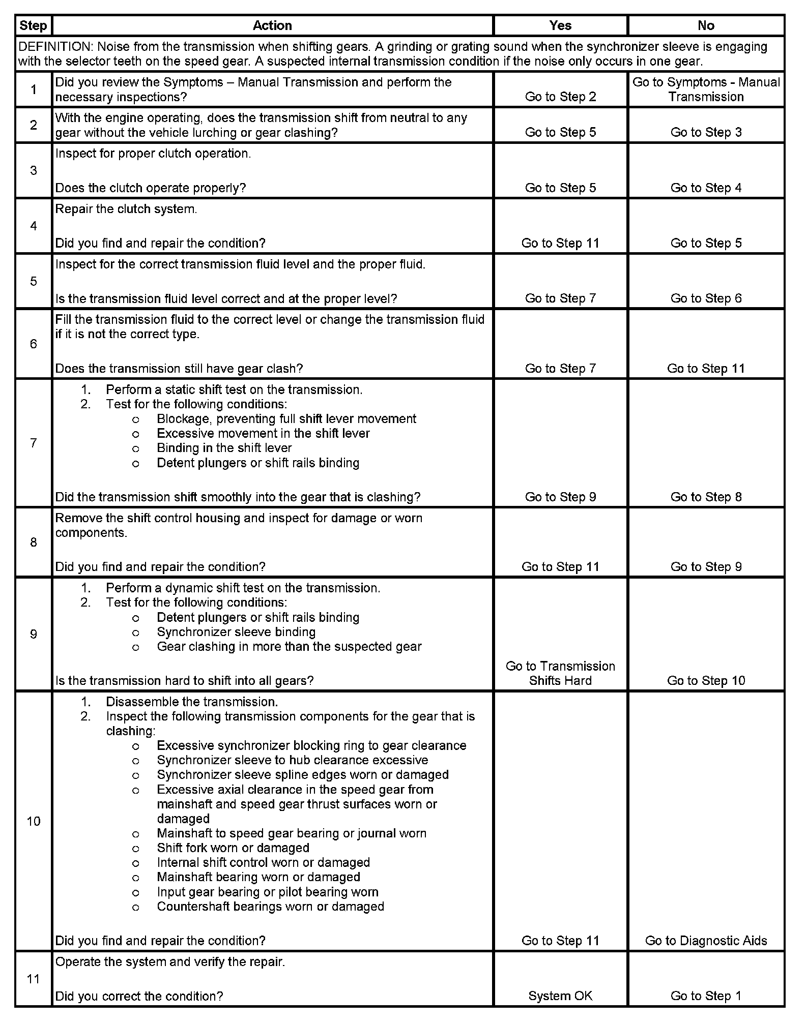 Gear clash may be caused by shifting at too high of an engine RPM or by rushing the shift. If gear clash occurs in more than one gear, the clutch may not be releasing properly for proper synchronizer operation.