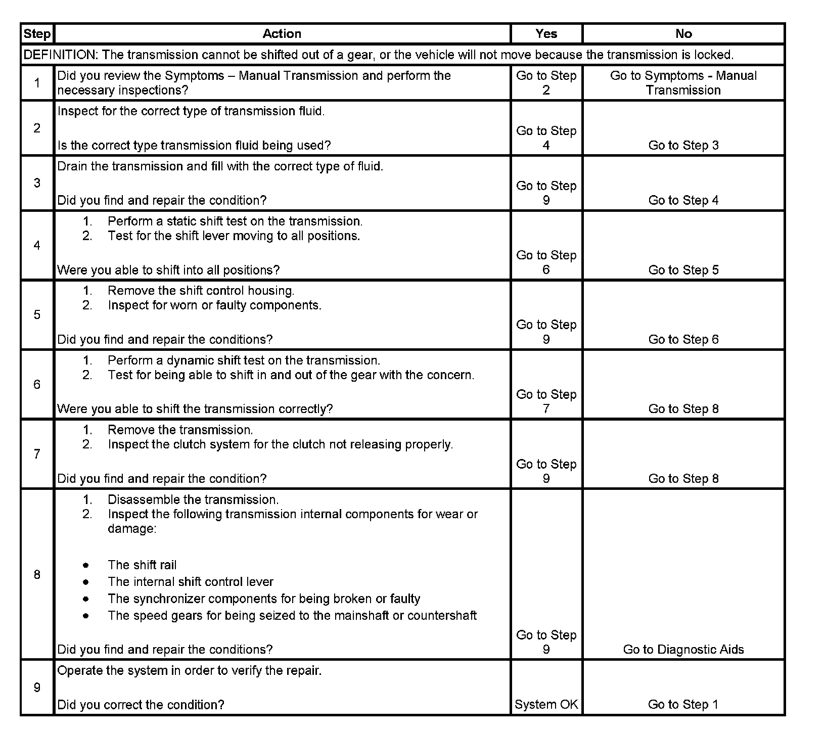 4. A static shift test is performed by shifting into all gears with the engine not operating. By confirming that the transmission can be shifted into all positions, ensures that the shift lever is not excessively worn or damaged.