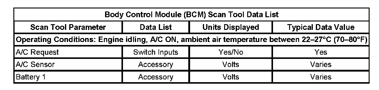 Body Control Module (BCM) Scan Tool Data List: