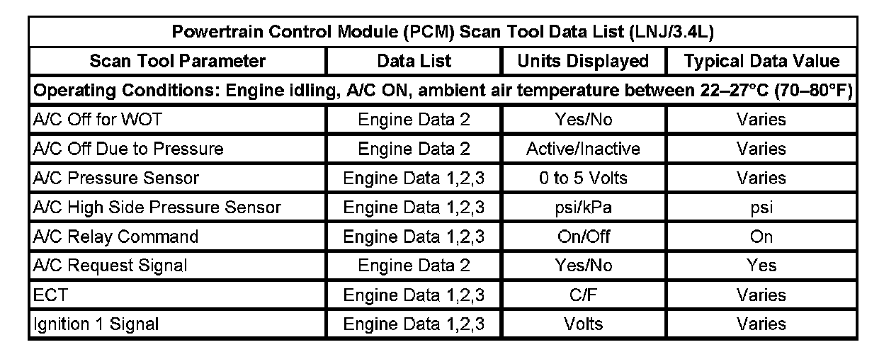 Powertrain Control Module (PCM) Scan Tool Data List: