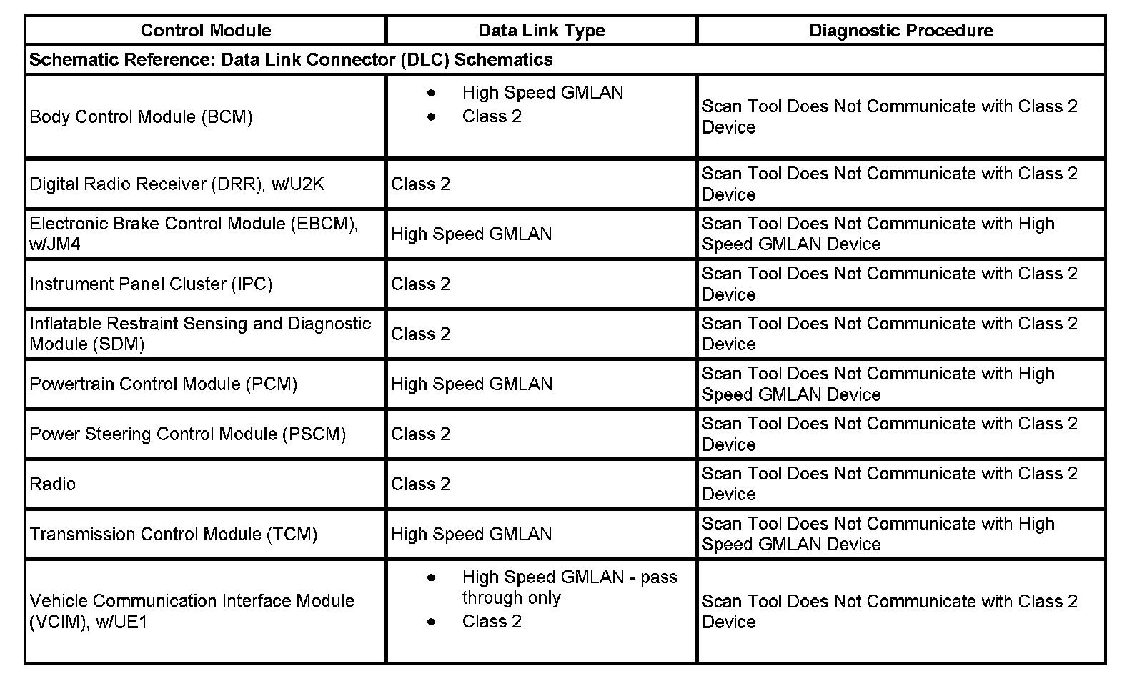 This table identifies which serial data link that a particular module uses for in-vehicle data transmission. Some modules may use more than one data link to communicate. Some modules may have multiple communication circuits passing through them without actively communicating on that data link. This table is used to assist in correcting a communication malfunction. For the description and operation of these serial data communication circuits, refer to Data Link Communications Description and Operation.