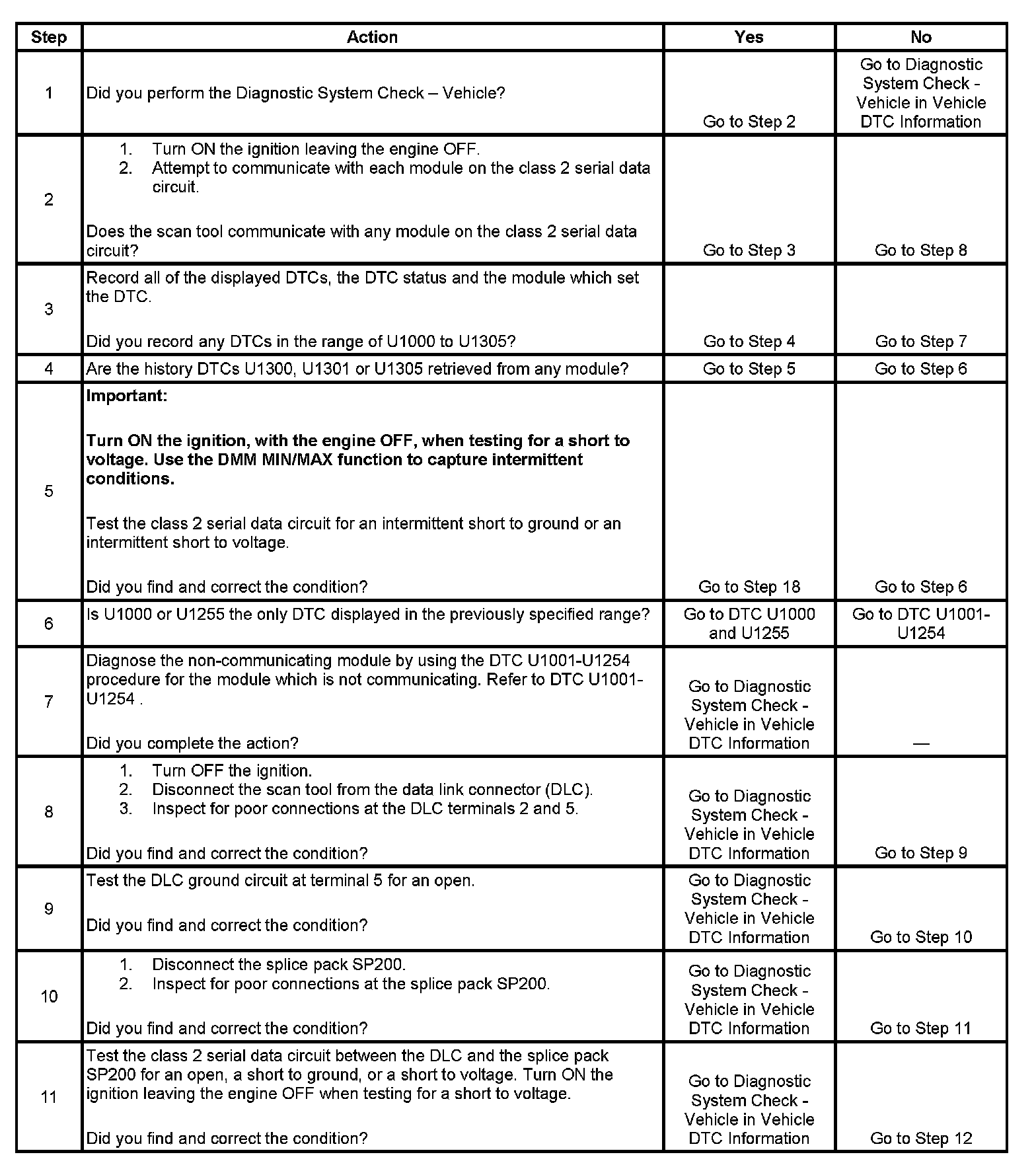 11. An open in the class 2 serial data circuit between the DLC and splice pack - SP200 will prevent the scan tool from communicating with any module. This condition will not set a DTC.