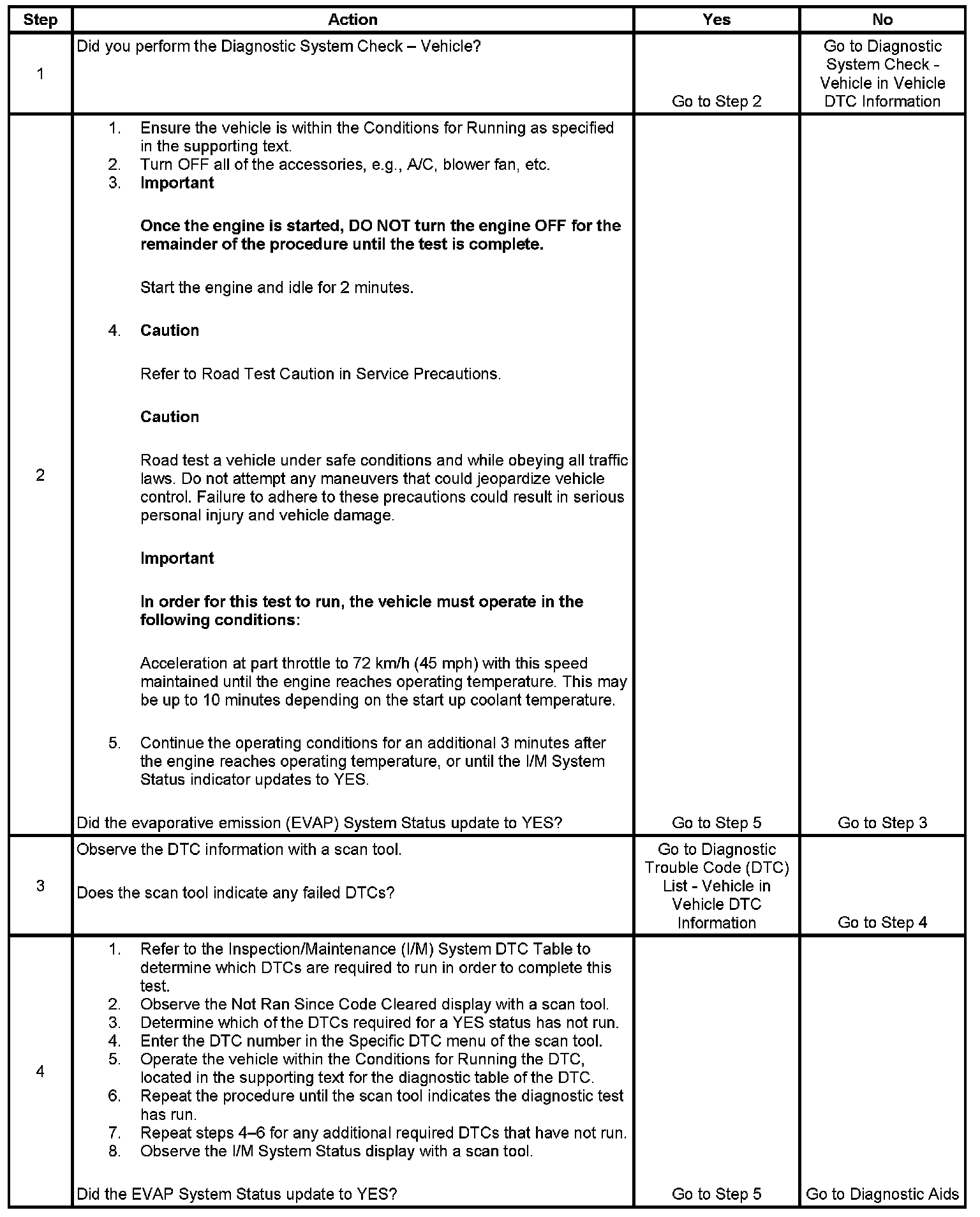 The purpose of this test is to satisfy the enable criteria necessary to execute inspection/maintenance (I/M) readiness diagnostics for the evaporative emission (EVAP) system. The test may be used to set the I/M System Status indicators to YES. The I/M System Status display on the scan tool provides an indication of when the control module has completed the required tests. The I/M System Status does not indicate that the tests have passed or failed. When all of the diagnostics for a specific system have run and passed, the I/M System Status will update to YES. If a test for a specific system has failed, the I/M System Status will update to YES, indicating a determination was made, even if all of the other tests for that system have not run. Performing a visual inspection prior to running the EVAP test may prevent having to repeat the test. A failed or aborted test will require the vehicle to cool down in order to meet the enable criteria to run another test.