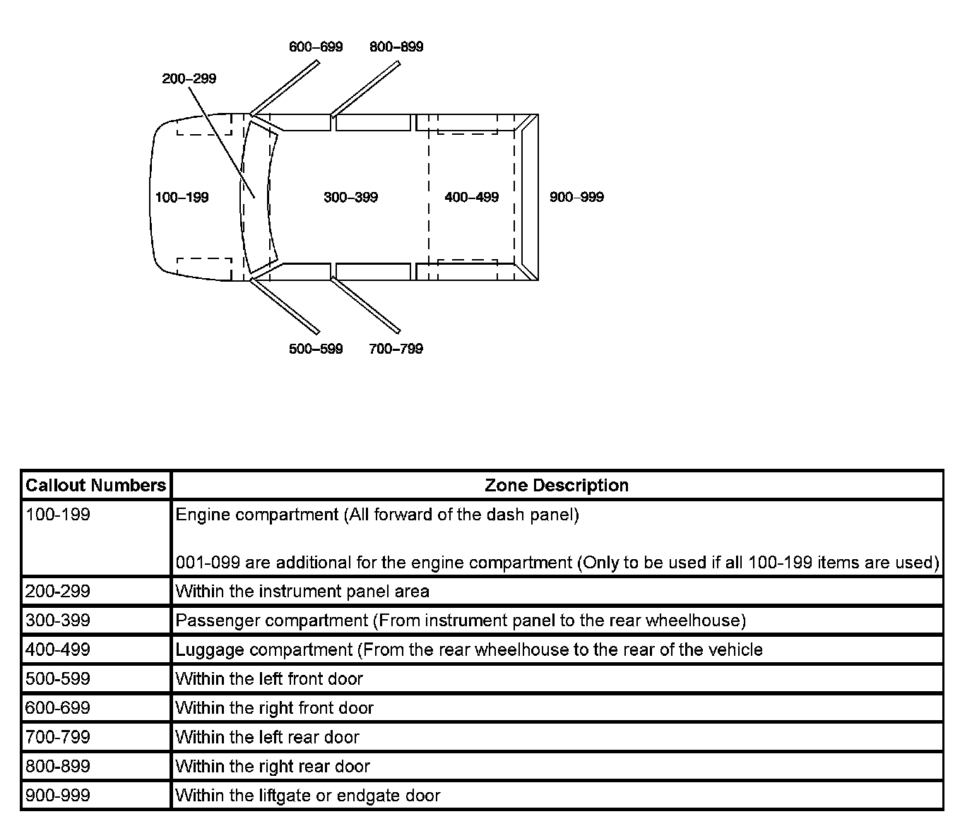 All grounds, in-line connectors, pass-through grommets, and splices have identifying numbers that correspond to where they are located in the vehicle. The table explains the numbering system.