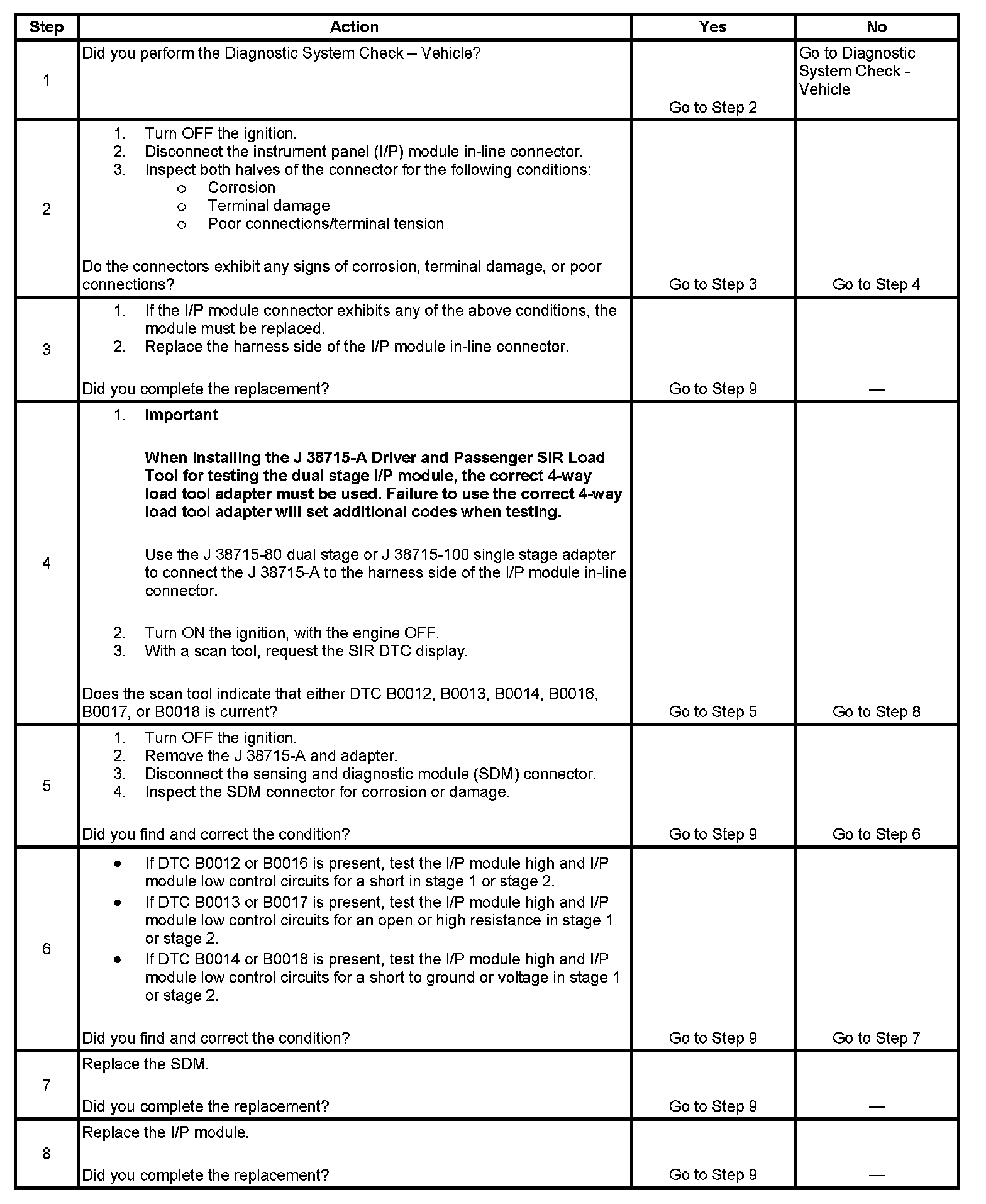 - DTC B0012 - stage 2 or B0016 - stage 1 will set when the SDM detects the I/P module deployment loop resistance is less than 1.3 ohms for 500 milliseconds.