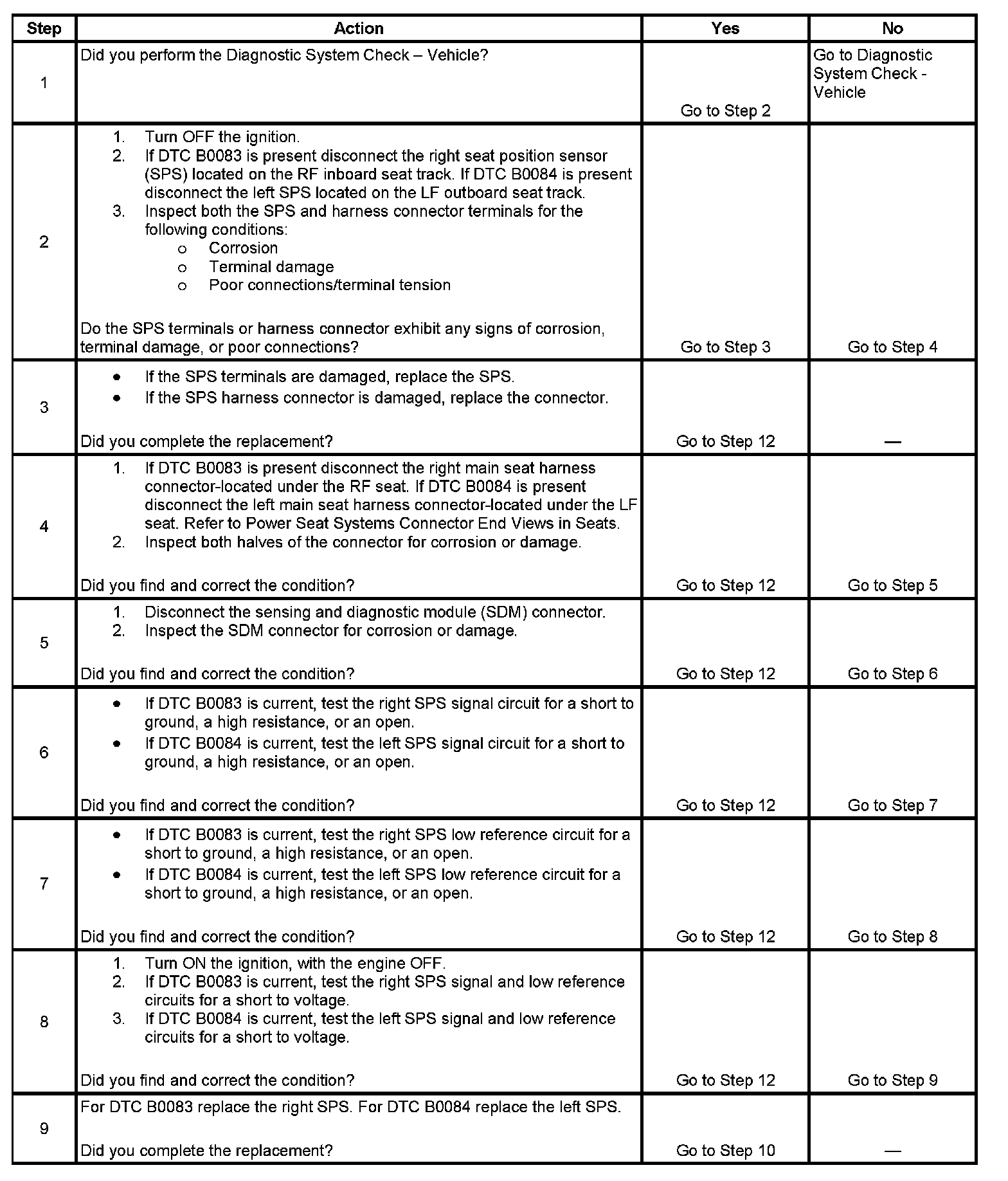 The inflatable restraint seat position sensor (SPS) is used to determine the proximity of a front driver or passenger seat position with respect to the frontal air bag. The SPS interfaces with the sensing and diagnostic module (SDM). The state of the SPS allows the SDM to disable stage 2 of the frontal air bag for a front seat that is forward of a forward/rearward point in seat track travel. The SPS is a Hall effect sensor that is mounted on the seat track of both the driver and passenger seats. The seat track includes a metal bracket that shunts the SPS magnetic circuit creating 2 states of seat position. The shunted state represents a rearward seat position. The non-shunted state represents a forward position. The SPS provides 2 current ranges, one range for the shunted state and a second range for a non-shunted state. These 2 states are inputs to the SDM. State 1 (shunted) being the rearward threshold and state 2 (non-shunted) being the forward threshold. When the SDM receives input from a SPS that state 1 threshold is reached (seat is rearward) the SDM will not disable stage 2 deployment, if required by the deployment sensors. When state 2 threshold is reached (seat is forward) the SDM will disable stage 2 deployment on the side the seat is forward. The SDM monitors the SPS circuit and if a fault is detected the SDM will set codes B0083 or B0084 and defaults to disabling stage 2 frontal deployment. This will only default on the side of the vehicle the sensor has a fault. Its important to understand that the SPS is secondary to the passenger presence system (PPS) and the manual instrument panel module (IPM) disable switch. If either one of these devices are in the disable mode the passenger air bag will not deploy regardless of the SPS status.