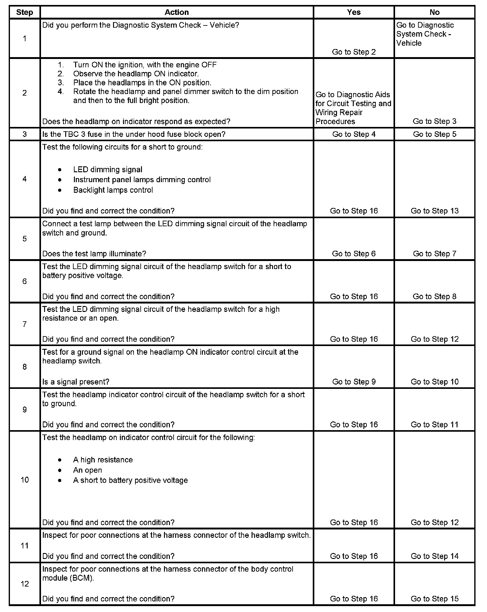 - The LED dimming signal circuit is open, shorted to ground, or shorted to battery positive voltage.