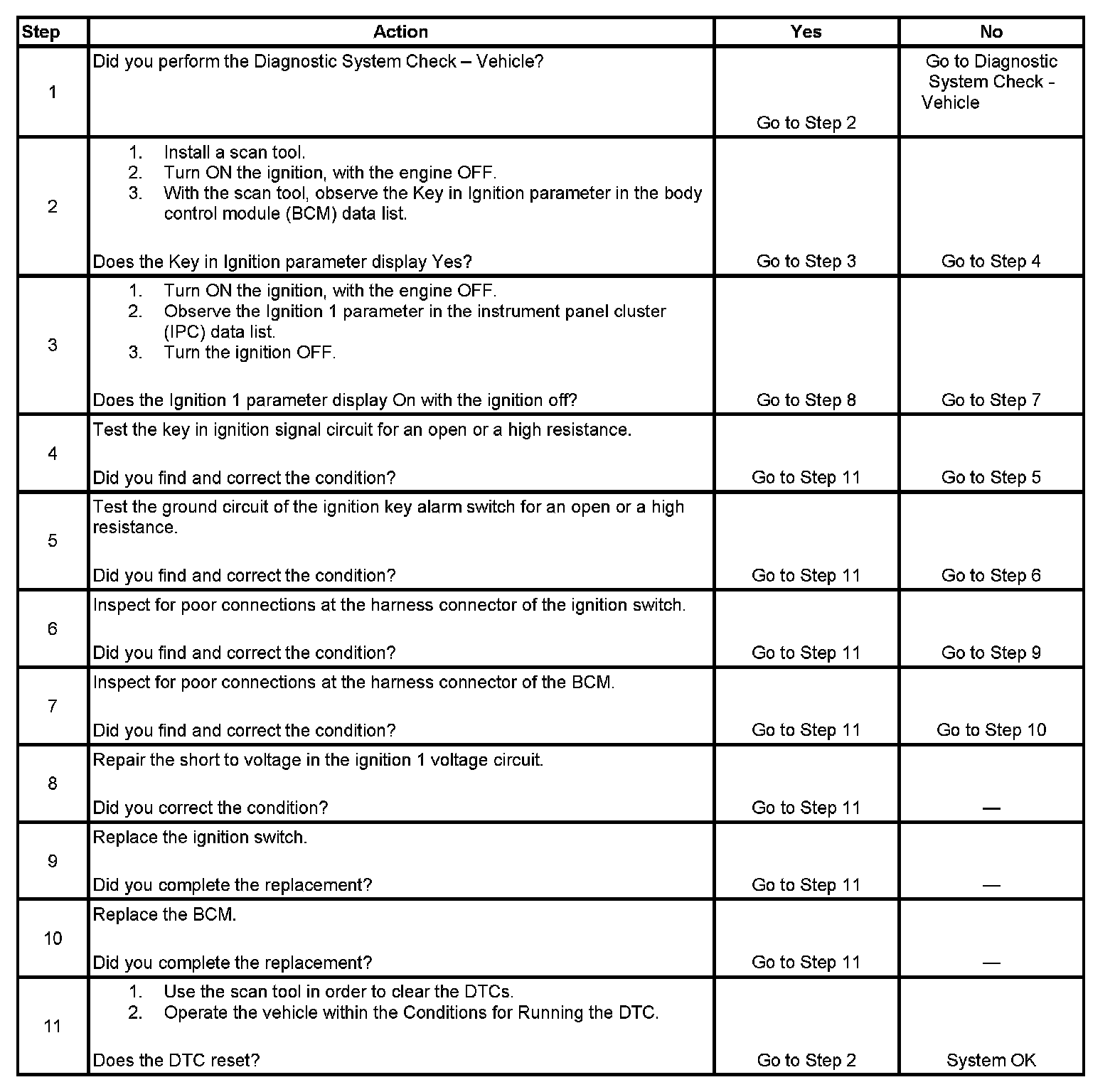 - The ignition 1 input is active and the key in ignition switch signal circuit is inactive and the signal circuit is high.