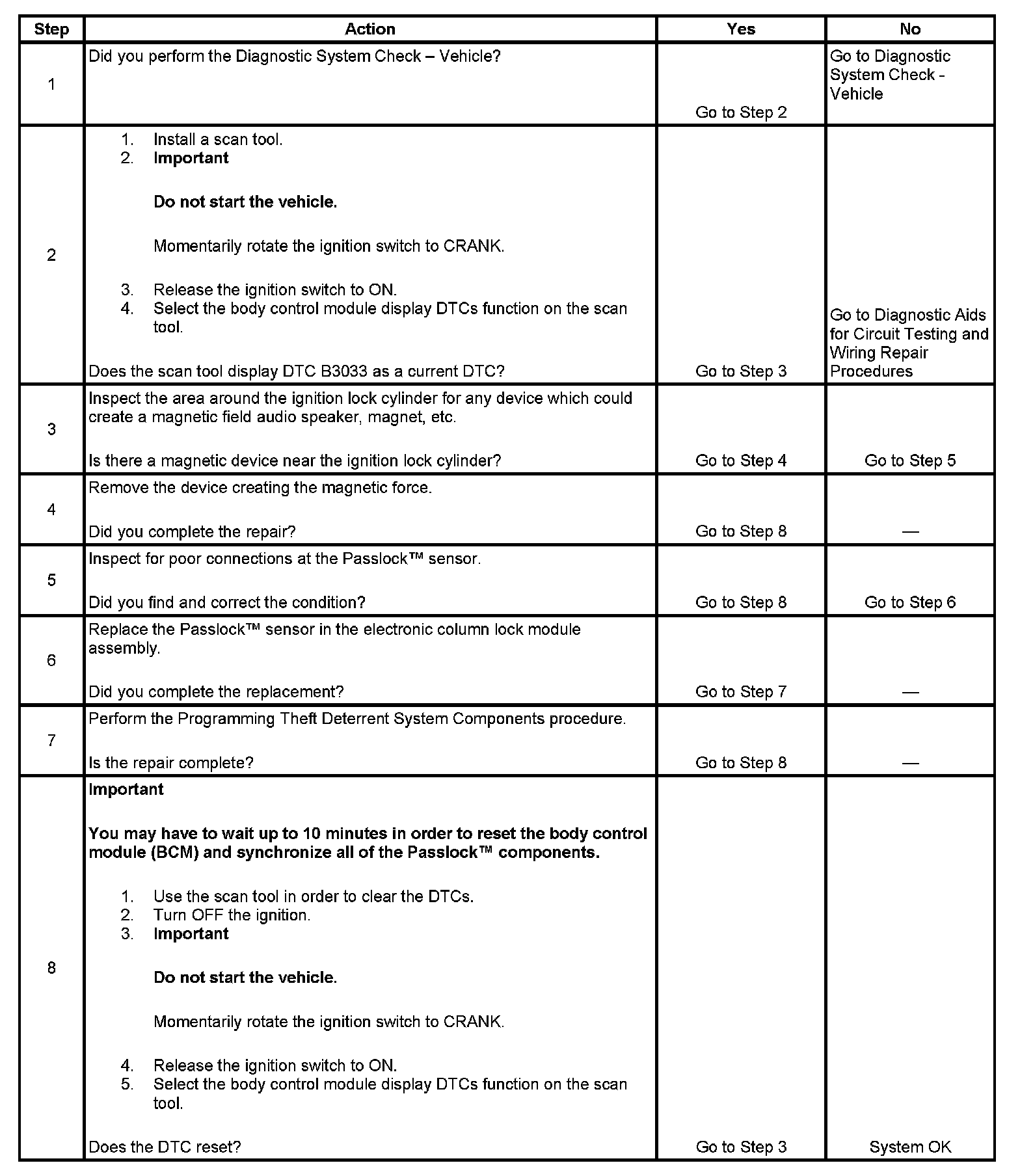 When the correct key is used to start the vehicle, a magnet on the lock cylinder passes close to the Passlock(TM) sensor within the ignition lock cylinder case. The magnet activates the security hall effect sensor in the Passlock(TM) sensor which completes a circuit from the security sensor signal circuit through a resistor to the security sensor low reference circuit. The resistance value will vary from vehicle to vehicle. The BCM will measure the voltage on the security sensor signal circuit and compare this voltage to a previously learned voltage. If the voltage measured is within the valid range, the BCM will send a class 2 message to the powertrain control module (PCM) to enable vehicle starting. If the voltage measured is not within the valid range, a class 2 message will be sent to the PCM to disable starting of the vehicle.