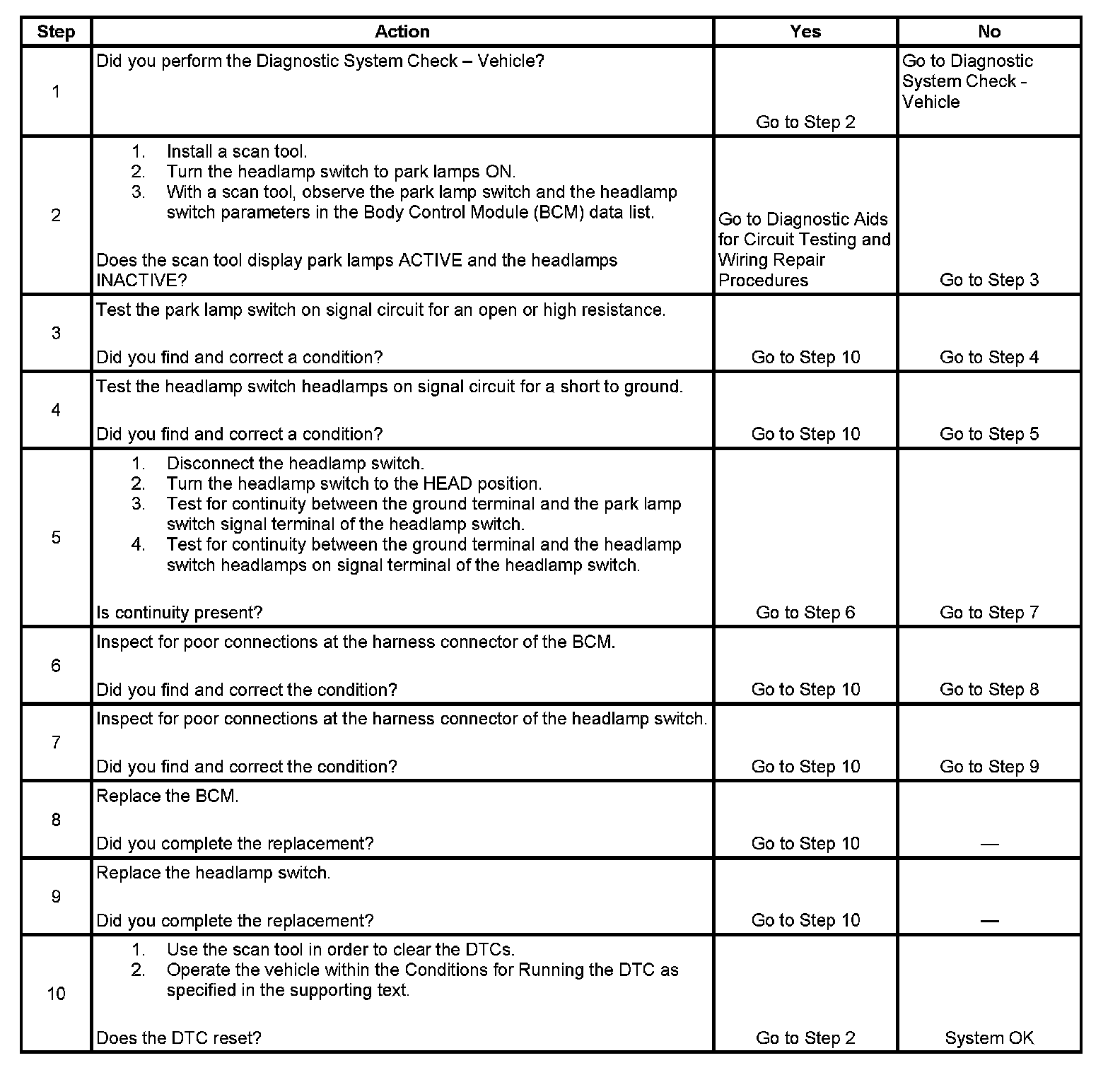 The body control module (BCM) monitors the park lamp switch on signal circuit and the headlamp switch headlamps on signal circuit in order to determine when the park lamps and headlamps should be illuminated. When the headlamp switch is turned to PARK, the BCM senses that the park lamp switch signal on circuit is grounded and the headlamps switch headlamps ON signal circuit is open. The BCM will then energize the park lamp relay illuminating the park lamps. When the headlamp switch is turned to HEAD, the BCM senses that the park lamp switch on signal circuit and the headlamp switch headlamps ON signal circuit are grounded. The BCM will then energize the park lamp relay and headlamp low beam relay or high beam relay illuminating the park lamps and headlamps.