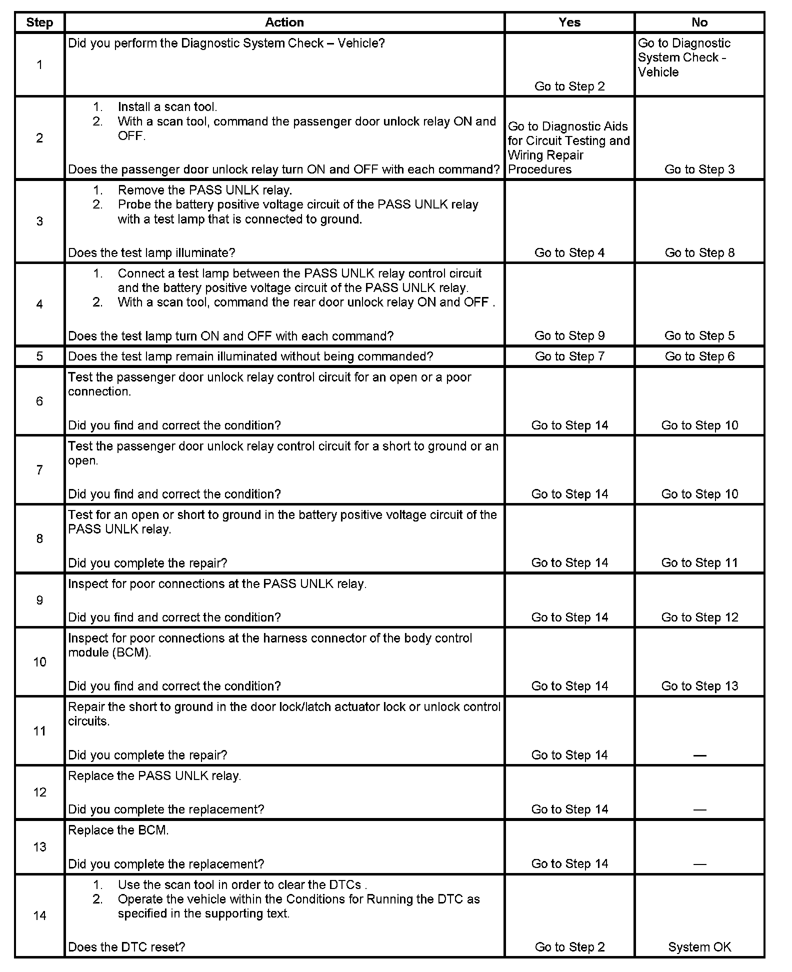 The DTC will set if the passenger door unlock relay control circuit is shorted to ground or open for more than one second.