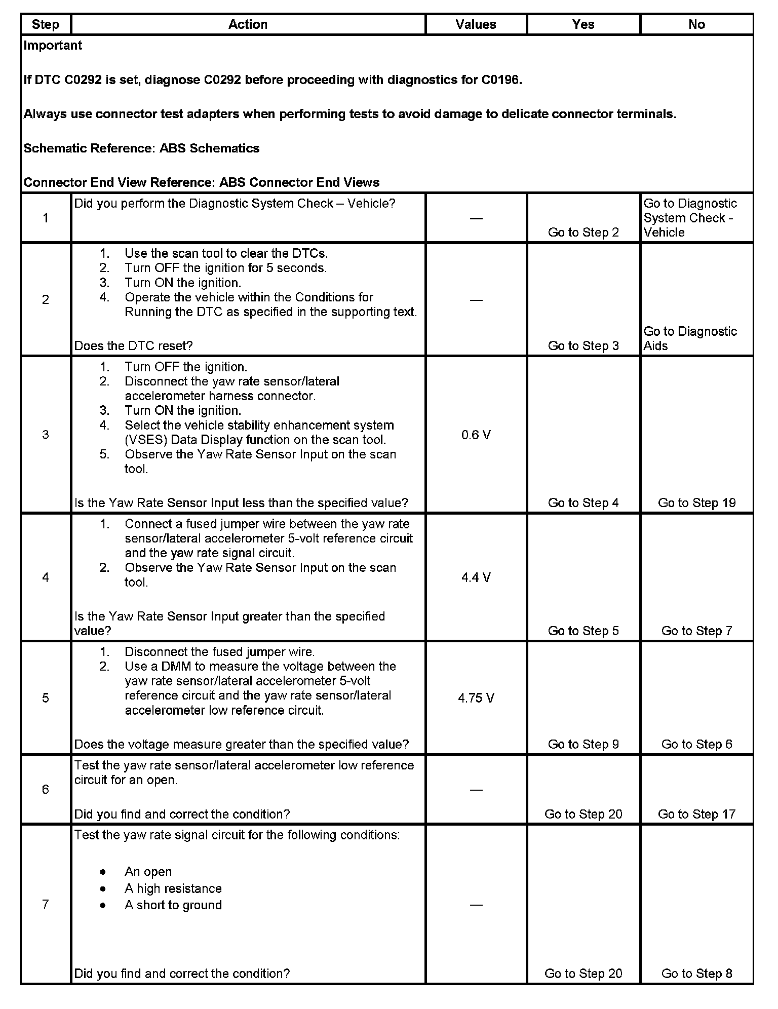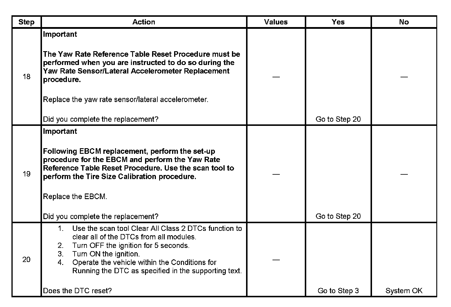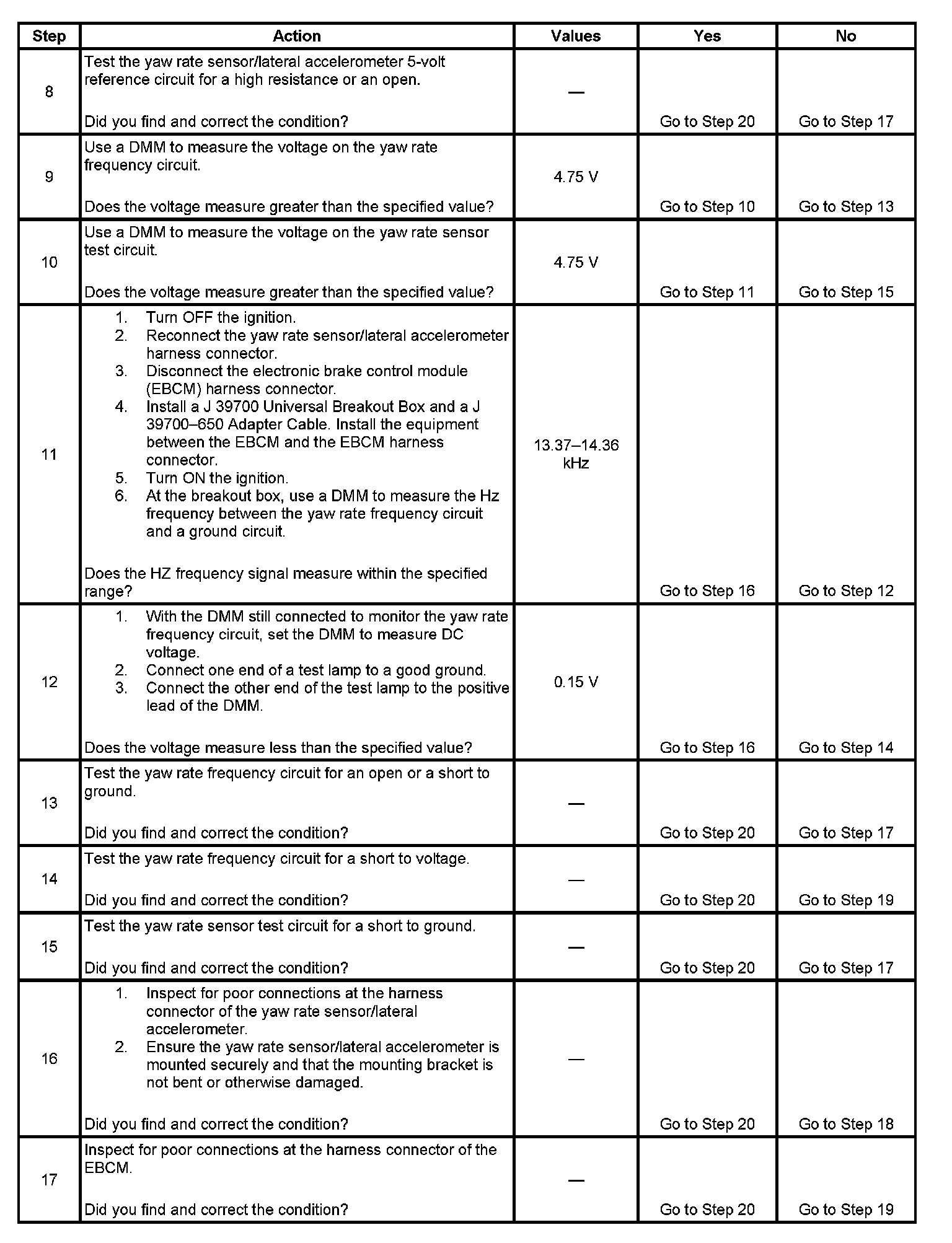 ^ This DTC may also set falsely if the yaw rate sensor is replaced without first following the diagnostic table below. Whenever a new yaw rate sensor is installed, the old sensor must be disconnected, the ignition turned ON for 5 seconds and then OFF, and then the new sensor connected.