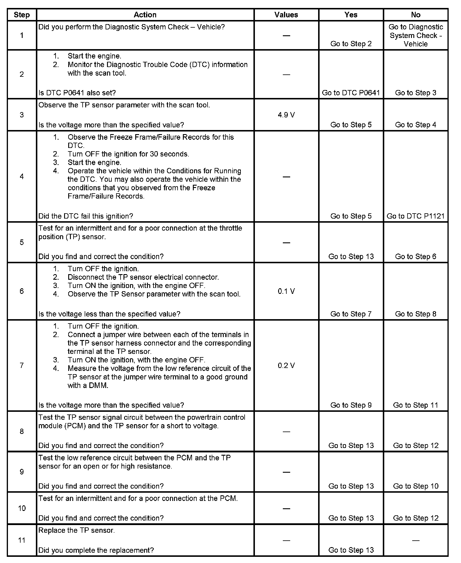 The throttle position (TP) sensor is used by the powertrain control module (PCM) to determine the throttle plate angle for various engine management systems. The TP sensor is a potentiometer type sensor with a 5-volt reference circuit, a low reference circuit, and a signal circuit. The PCM provides the TP sensor with 5 volts on the 5-volt reference circuit and a ground on the low reference circuit. Rotation of the TP sensor rotor from the closed throttle position to the wide open throttle (WOT) position provides the PCM with a signal voltage from less than 1 volt to more than 4 volts through the TP sensor signal circuit. If the PCM detects an excessively high signal voltage, DTC P0123 sets.