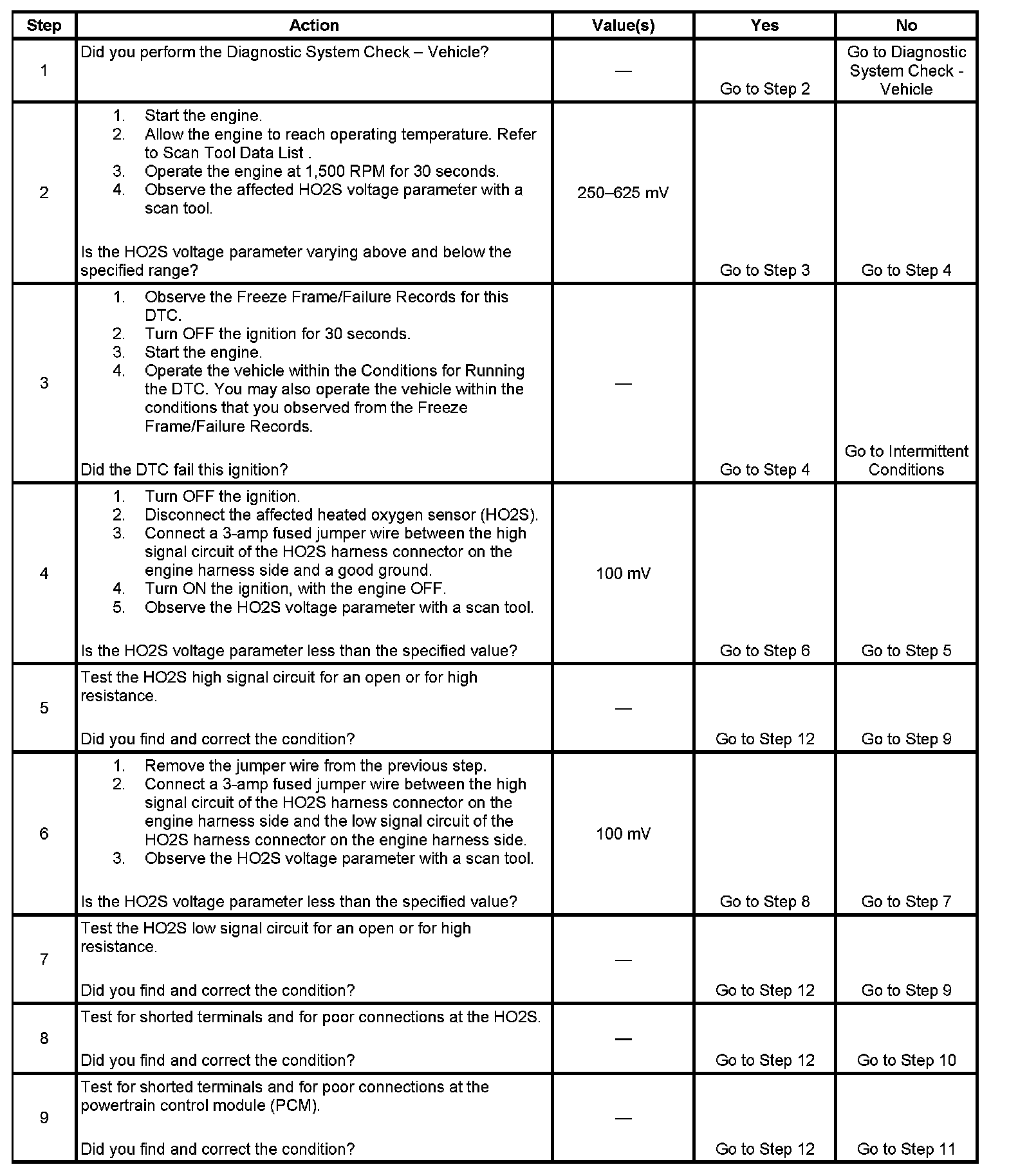 Heated oxygen sensors (HO2S) are used for fuel control and post catalyst monitoring. Each HO2S compares the oxygen content of the surrounding air with the oxygen content in the exhaust stream. The HO2S must reach operating temperature to provide an accurate voltage signal. Heating elements inside the HO2S minimize the time required for the sensors to reach operating temperature. The powertrain control module (PCM) supplies the HO2S with a reference, or bias, voltage of about 450 mV. When the engine is first started the PCM operates in open loop, ignoring the HO2S voltage signal. Once the HO2S reaches operating temperature and closed loop is achieved, the HO2S generates a voltage within a range of 0-1,000 mV that fluctuates above and below bias voltage. High HO2S voltage indicates a rich exhaust stream; low HO2S voltage indicates a lean exhaust stream. This diagnostic will only run once per ignition cycle. The PCM monitors the rich-to-lean and lean-to-rich transition time. A transition is defined as, the HO2S voltage changes from greater than 625 mV to less than 250 mV or from less than 250 mV to greater than 625 mV. If the PCM detects that the transition time is too long, DTC P0133 sets for HO2S bank 1 sensor 1, or DTC P0153 sets for HO2S bank 2 sensor 1.