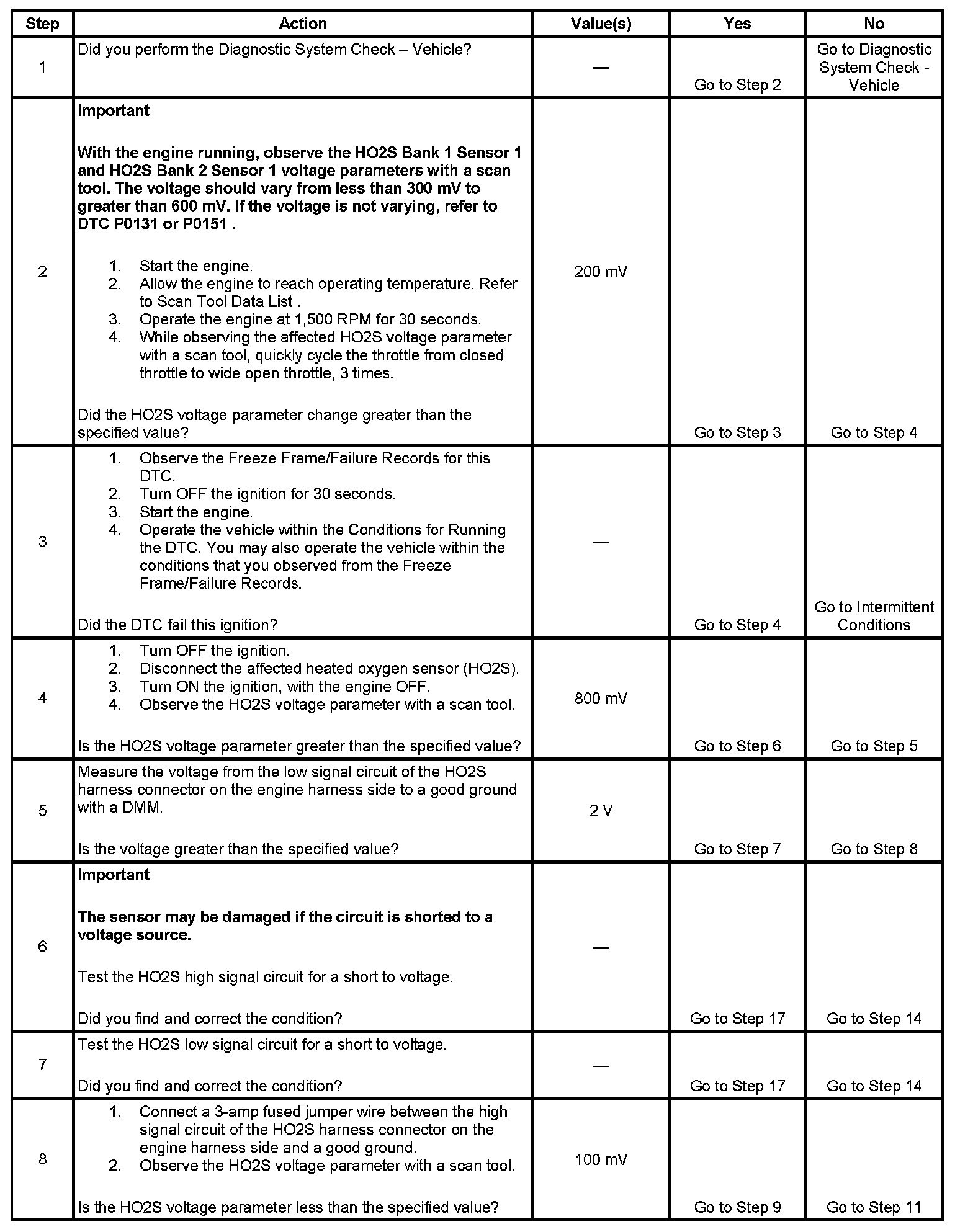 Heated oxygen sensors (HO2S) are used for fuel control and post catalyst monitoring. Each HO2S compares the oxygen content of the surrounding air with the oxygen content in the exhaust stream. The HO2S must reach operating temperature to provide an accurate voltage signal. Heating elements inside the HO2S minimize the time required for the sensors to reach operating temperature. The powertrain control module (PCM) supplies the HO2S with a reference, or bias, voltage of about 450 mV. When the engine is first started the PCM operates in open loop, ignoring the HO2S voltage signal. Once the HO2S reaches operating temperature and closed loop is achieved, the HO2S generates a voltage within a range of 0-1,000 mV that fluctuates above and below bias voltage. High HO2S voltage indicates a rich exhaust stream; low HO2S voltage indicates a lean exhaust stream. If the PCM detects an HO2S voltage that stays above a specified value, DTC P0138 sets for HO2S bank 1 sensor 2, or DTC P0158 sets for HO2S bank 2 sensor 2.