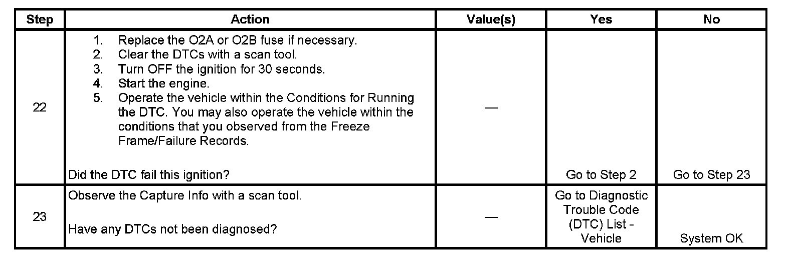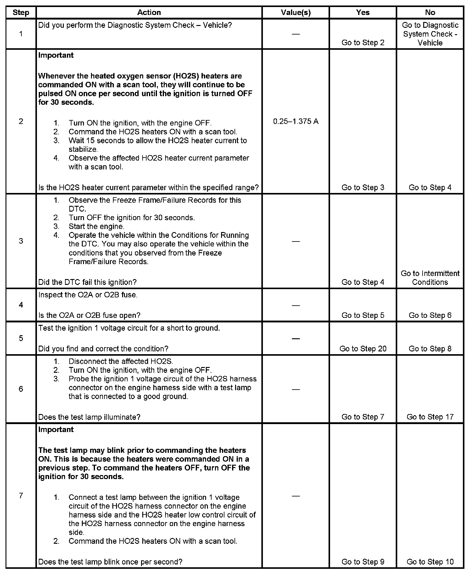 The heated oxygen sensor (HO2S) must reach operating temperature to provide an accurate voltage signal. A heating element inside the HO2S minimizes the time required for the sensor to reach operating temperature. Voltage is provided to the heater by the ignition 1 voltage circuit through a fuse. With the engine running, ground is provided to the heater by the HO2S heater low control circuit, through a low side driver within the powertrain control module (PCM). The PCM commands the heater ON or OFF to maintain a specific HO2S operating temperature range. The PCM determines the temperature by measuring the current flow through the heater. When the heater is in the ON state, the PCM will pulse the heater OFF for a duration of 50 ms, once per second. When the heater is in the OFF state, the PCM will pulse the heater ON for a duration of 50 ms, once per second. The PCM monitors the heater current with the engine running. This diagnostic will only run once per ignition cycle. If the PCM detects that the heater current or the heater calculated resistance is not within the expected range, the following DTCs will set: