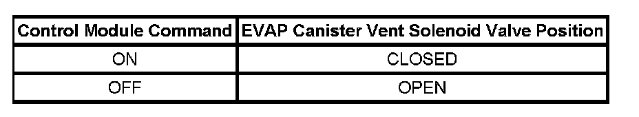The table illustrates the relationship between the ON and OFF states, and the OPEN or CLOSED states of the EVAP canister vent solenoid valve.