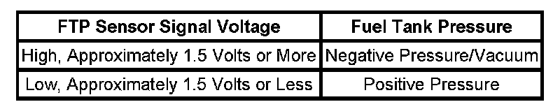 The table illustrates the relationship between the FTP sensor signal voltage and the EVAP system pressure/vacuum.