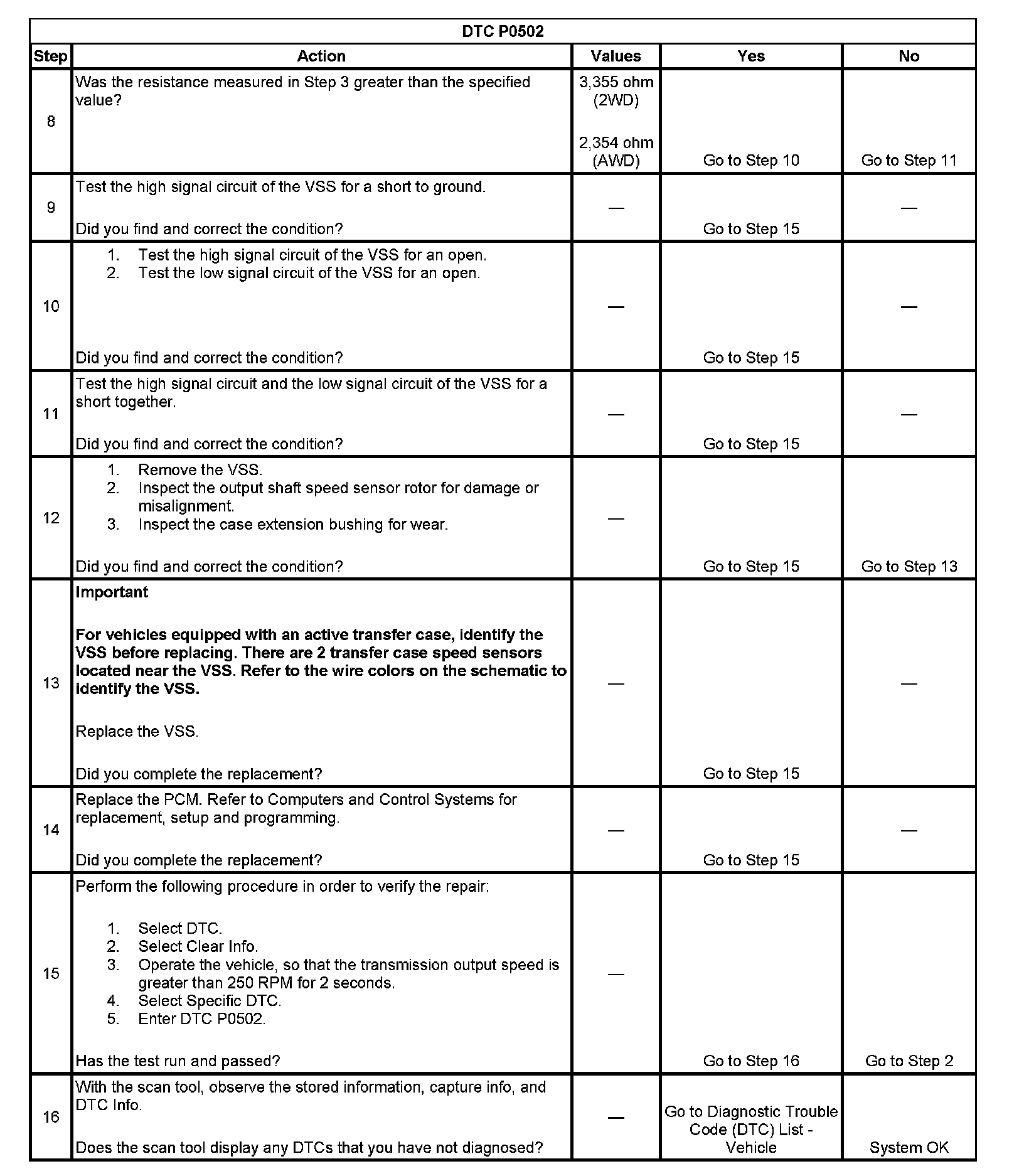 When the PCM detects a low vehicle speed when there is a high engine speed in a drive gear range, then DTC P0502 sets. DTC P0502 is a type B DTC.