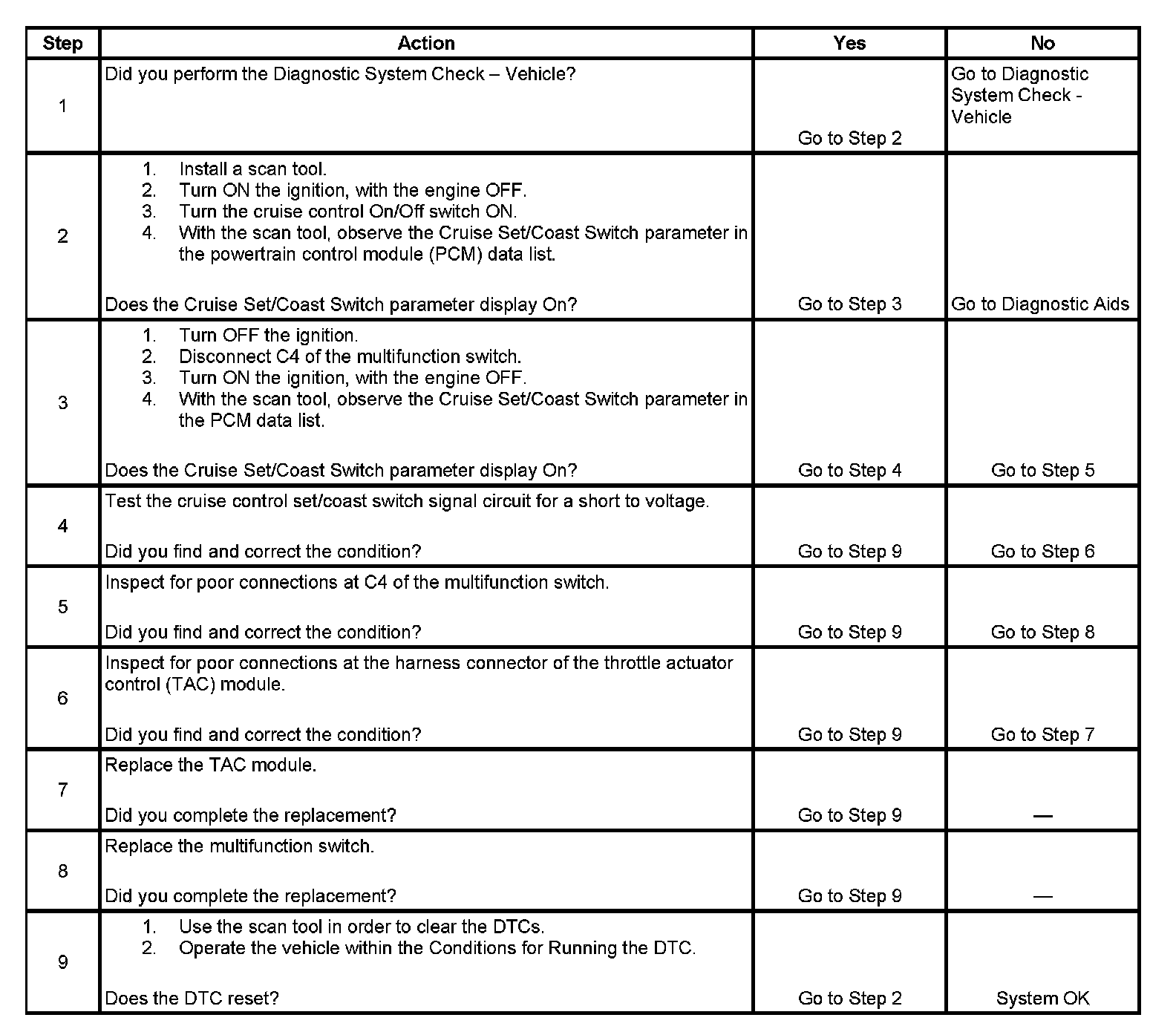 The cruise control set/coast switch is an input to the throttle actuator control (TAC) module. The TAC module uses the cruise control set/coast switch signal circuit in order to detect when the driver has requested to set the vehicle speed or to decelerate the vehicle speed. The TAC module detects a voltage signal on the cruise control set/coast switch signal circuit when the switch is applied. The TAC module sends a serial data signal to the powertrain control module (PCM) via the universal asynchronous receiver transmitter (UART) serial data circuit. This DTC sets if the PCM receives a serial data signal from the TAC module indicating that voltage is present on the cruise control set/coast switch signal circuit for longer than 90 seconds.